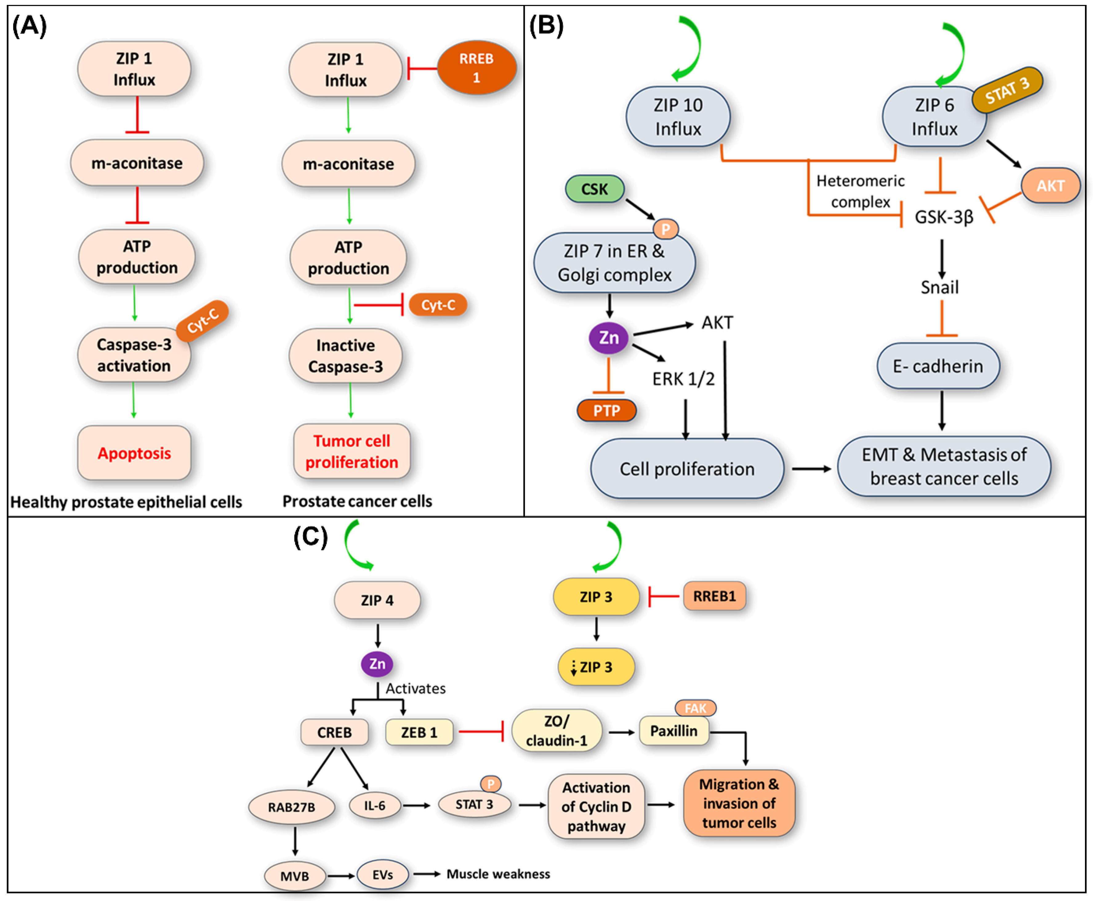 Figure 5. (A) The protective effect of Zn against the development of prostate cancer. In healthy prostate epithelial cells, the ZIP1 transporter plays a critical role in Zn uptake. In prostate cancer cells, ZIP1 expression is significantly reduced compared to normal prostate cells. This downregulation leads to decreased Zn uptake, which may contribute to prostate cancer growth and progression. (B) Overview of the functional roles of ZIP6, ZIP7, and ZIP10 in the molecular mechanisms of breast cancer. (C) Schematic illustration of ZIP4 overexpression in the promotion of pancreatic cancer.
