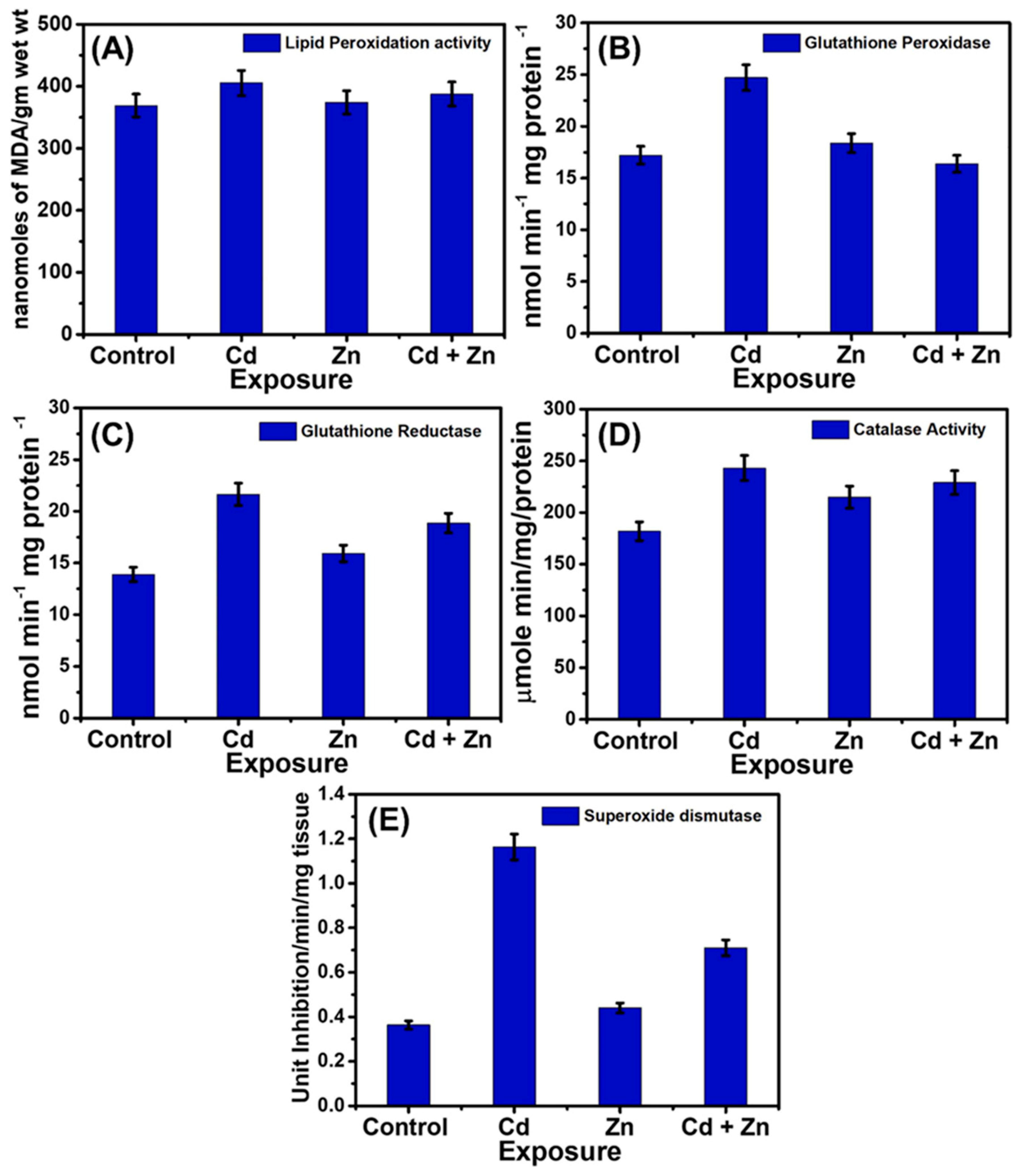 Figure 6. (A) Lipid peroxidase, (B) glutathione peroxidase, (C) glutathione reductase, (D) catalase, and (E) superoxide dismutase levels in liver tissue of zebrafish exposed to Cd and Zn (values represented are the mean of triplicates). One sample was made up of 14 fish livers (n  =  14 pools). Adapted from [133].