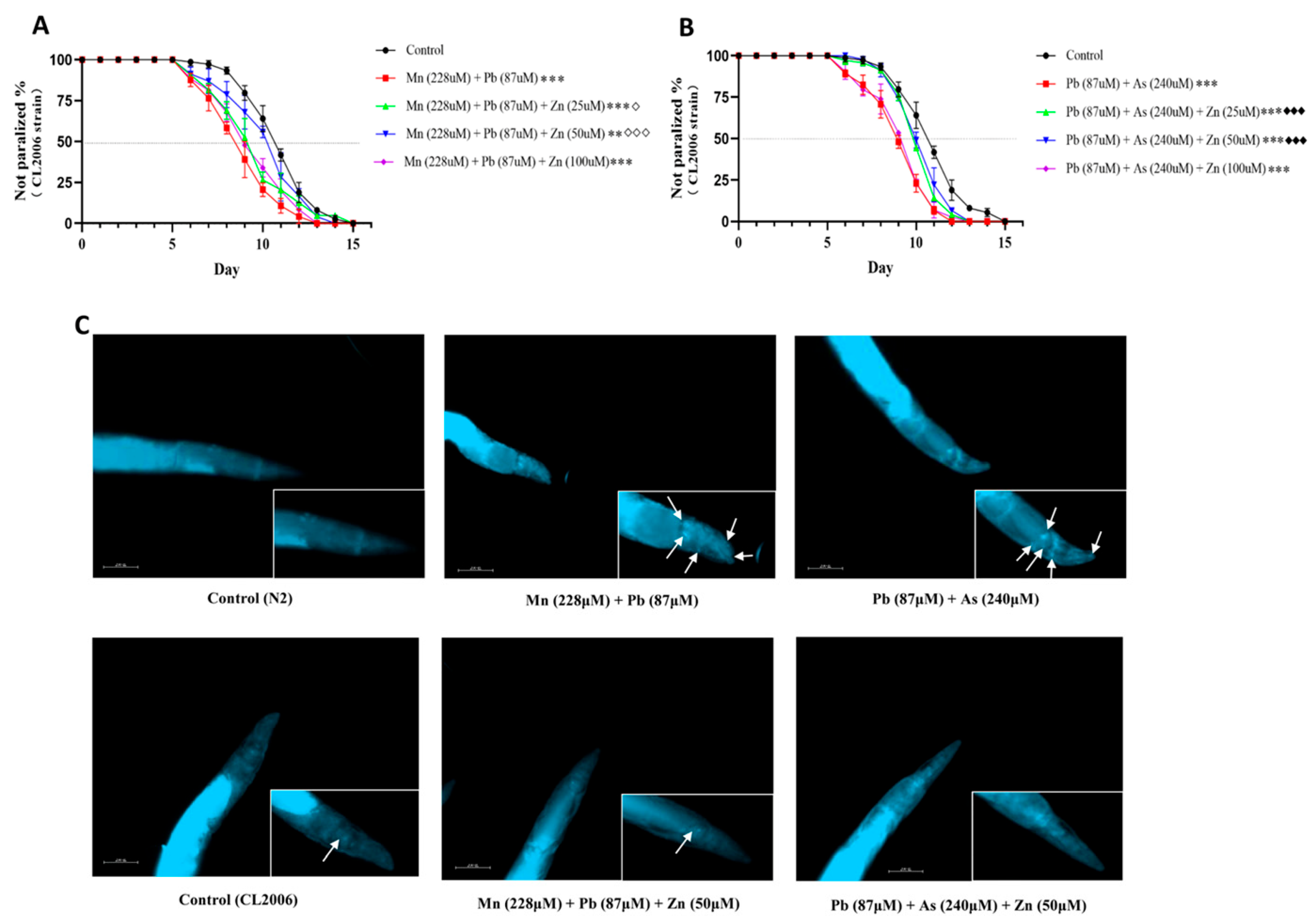 Figure 7. The effect of Zn homeostasis for paralysis behavior in transgenic nematodes CL2006. (A) The paralysis behavior of Mn + Pb mixture. (B) The paralysis behavior of Pb + As mixture. (C) Representative images of Aβ plaques in Mn + Pb and Pb + As mixtures. The Aβ plaques are located in the nematodes head region, indicated by arrows. Data are expressed as mean ± SD of three times independent experiments. The Kaplan–Meier statistics are indicated as follows: *, ◇, ◆: compared to control, Mn + Pb and Pb + As. Significant differences are denoted as */◇/◆: p < 0.05, **/◇◇/◆◆: p < 0.01 and ***/◇◇◇/◆◆◆: p < 0.005. Adapted from [139].