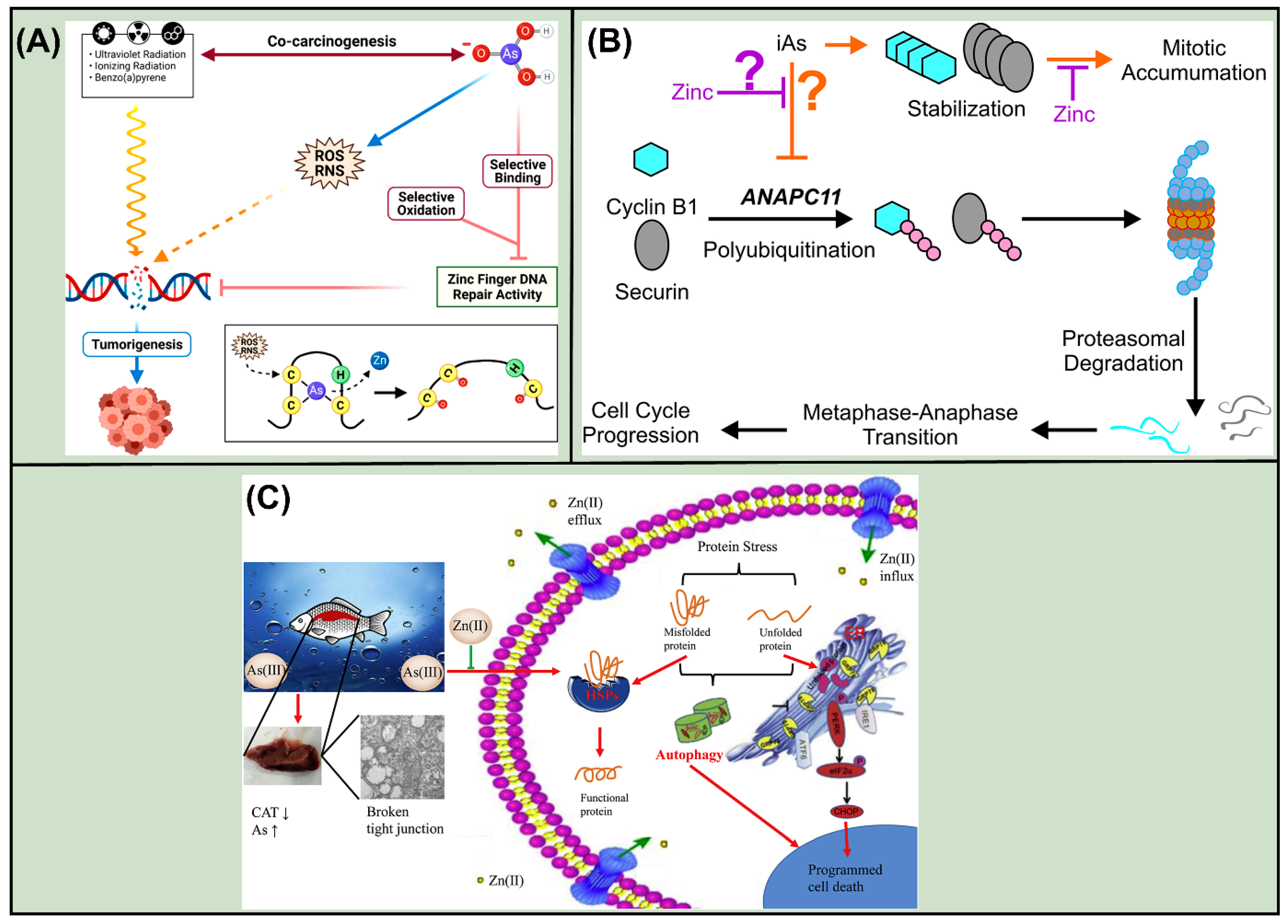 Figure 8. (A) Schematic illustration of arsenic co-carcinogenesis. Adapted from [140]. (B) Proposed mechanism of action by which iAs exposure induces mitotic accumulation. iAs exposure stabilizes cyclin B1 and securin preventing cells from progressing to anaphase from metaphase. Adapted from [141]. (C) Schematic depiction of the mechanism underlying zinc relieves arsenic-induced renal toxicity in common carps. Adapted from [117]. The arrows indicate the decreased catalase and increased arsenic.