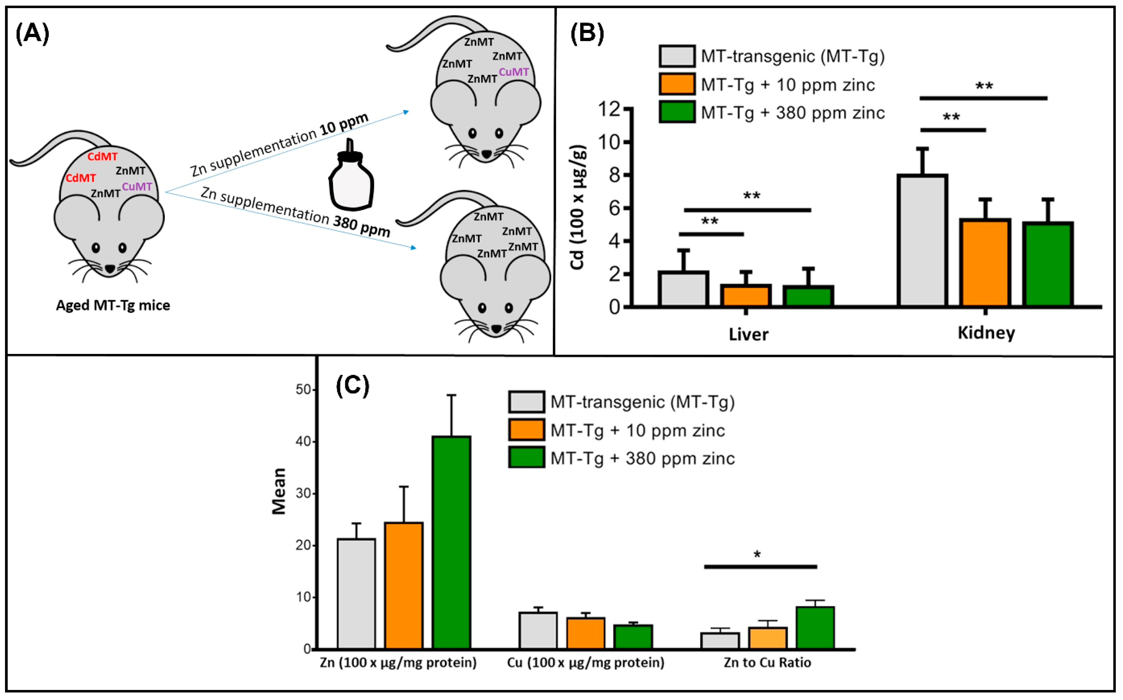Figure 9. (A) Schematic representation for the Zn supplementation in aged MT1-tg mice. (B) Effect of Zn supplementation (1 month) on tissue levels of Cd, Zn and Cu in aged MT1-tg mice. A: Effect of Zn supplementation (1 month) on liver and kidney levels of Cd in aged MT1-tg mice (age ≥ 610 days, n = 4–6 per group). (C) Effect of Zn supplementation (1 month) on Cu and Zn levels measured in liver lysates of aged MT1-tg mice (age ≥ 610 days, n = 5 per group). Adapted from [143]. “*” and “**” indicate the statistical analysis.