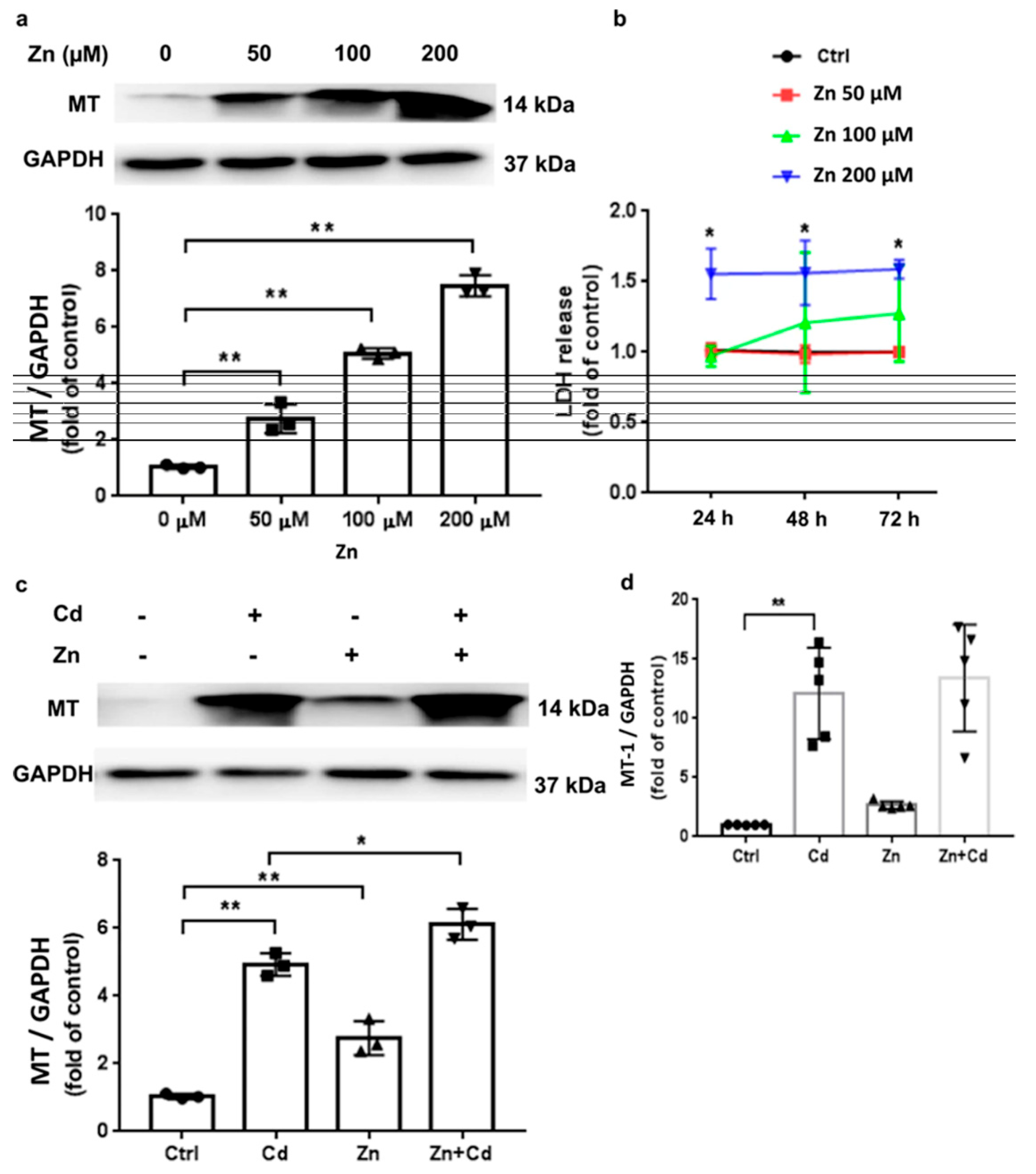 Figure 10. Zn and Cd effects on ECT MT expression. (a) MT expression after increasing Zn dose (50, 100, 200 µM) for 24 h. Group size is n  =  3 per dose. (b) LDH release after increasing Zn dose (50, 100, 200 µM) for different durations (24; 48; 72 h). Group size is n  =  3 per time point. (c) Effect of Zn (50 µM) and/or Cd (20 µM) on ECT MT protein content. Group size is n  =  3 per group. (d) Effect of Zn (50 µM) and/or Cd (20 µM) on MT-1 gene expression (qPCR). Group size is n  =  5 per group. * p<  0.05 and ** p  <  0.01 vs. corresponding Ctrl ECT. Adapted from [152].