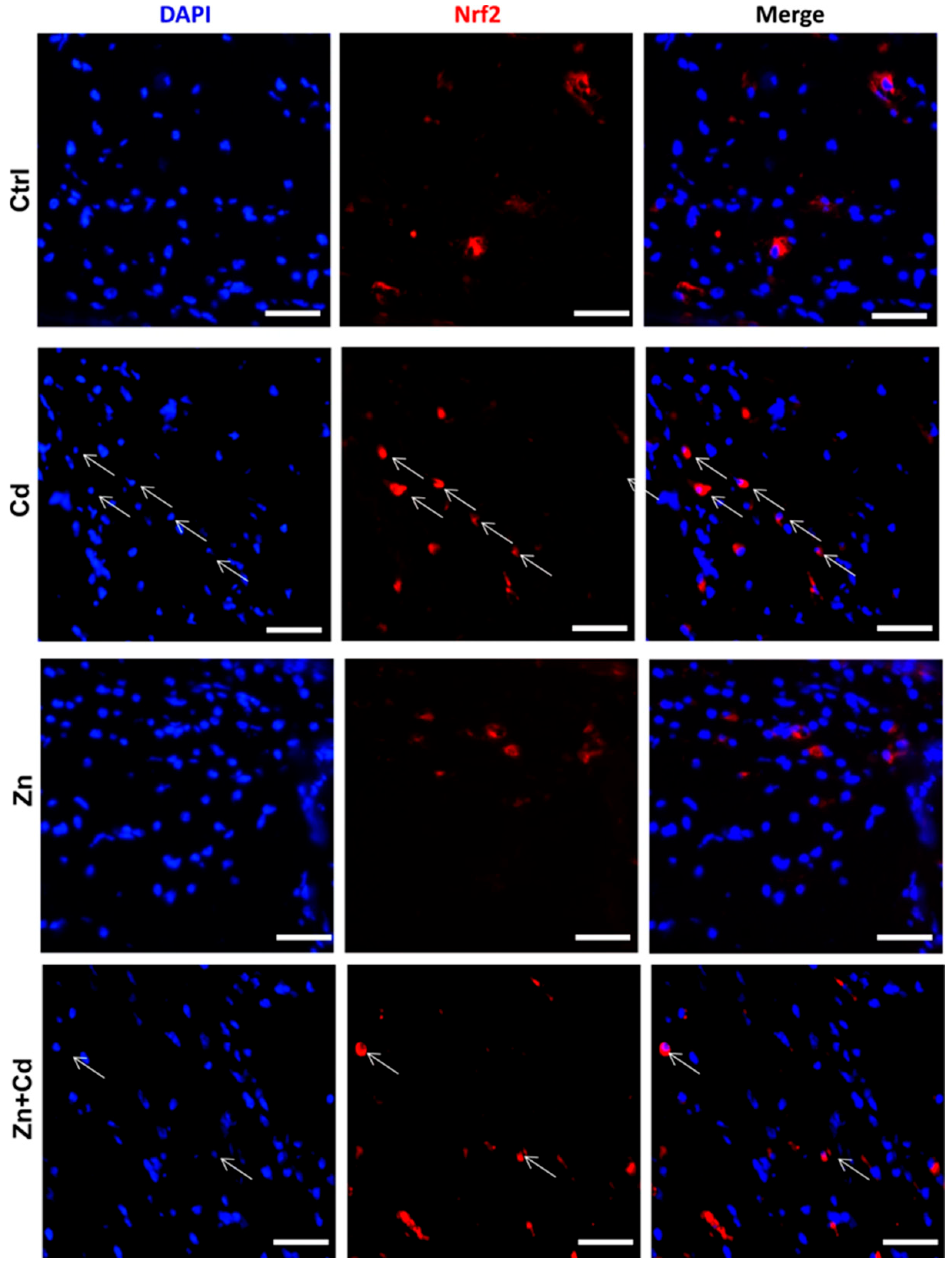 Figure 11. Evidence of ECT Nrf2 activation after Cd and/or Zn treatment. Representative ECT stained for Nrf2 (Red) and nuclei (DAPI, blue) following Zn (50 µM) and/or Cd (20 µM) for 24 h. Arrows indicate representative positive cells in which Nrf2 translocated into nucleus, ×40 magnification, scale bar  =  50 μm. Adapted from [152].