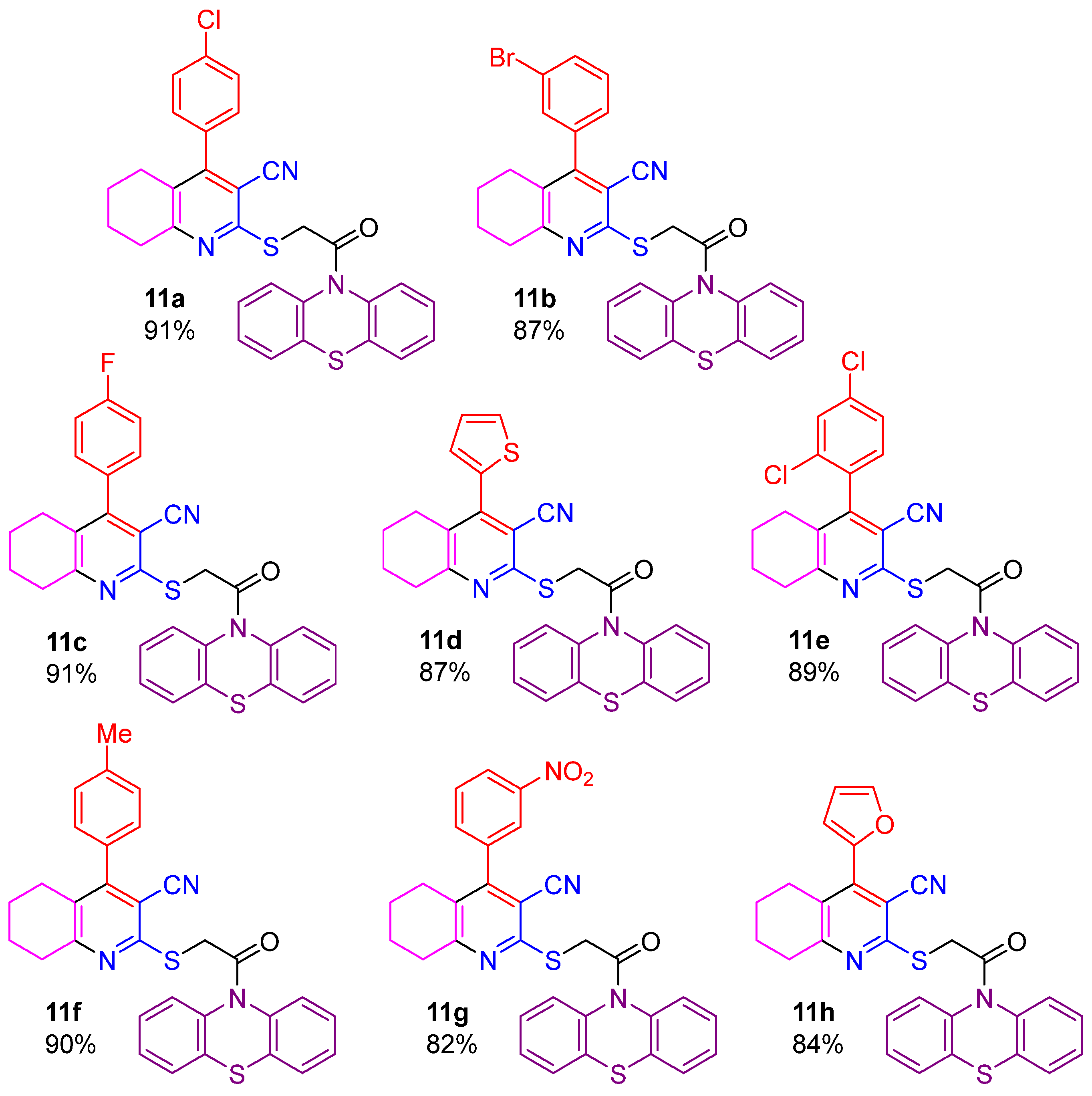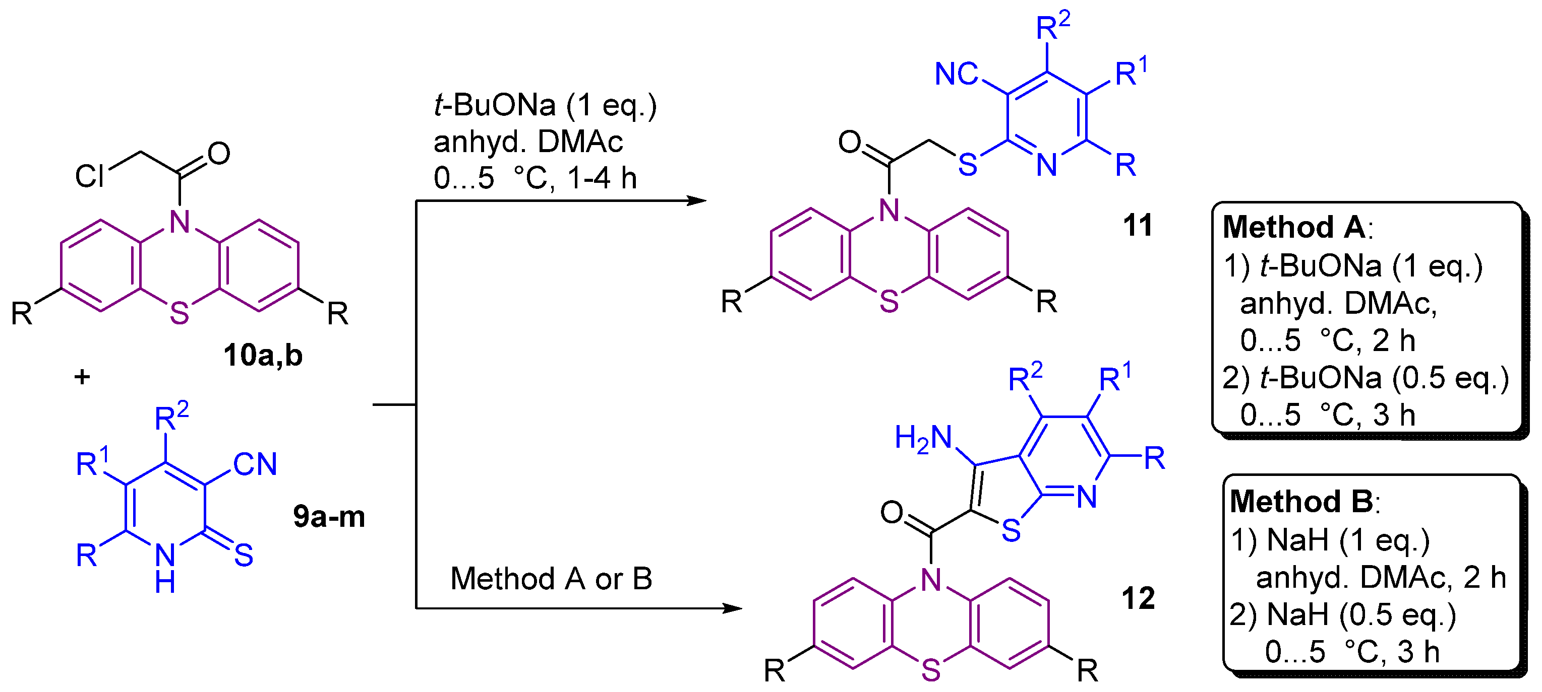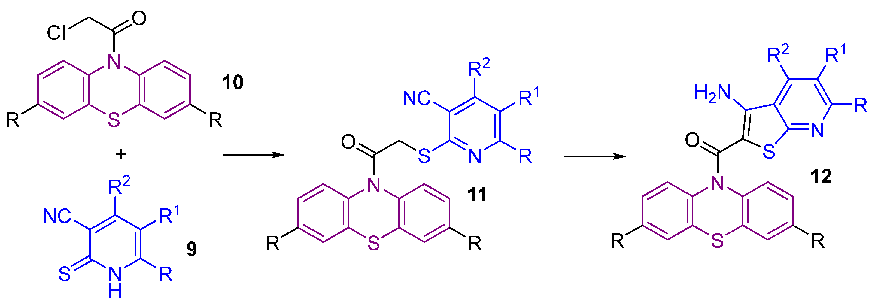 - Kindop, V.K.; Kindop, V.K.; Dotsenko, V.V.; Lukina, D.Y.; Aksenov, N.A.; Aksenova, I.V. The unexpected result of the Thorpe-Ziegler heterocyclization of N-[(3-cyanoquinolin-2-yl)thio]acetylphenothiazines promoted by KOH–CH3OH. Russ. Chem. Bull. 2025; accepted. [Google Scholar]