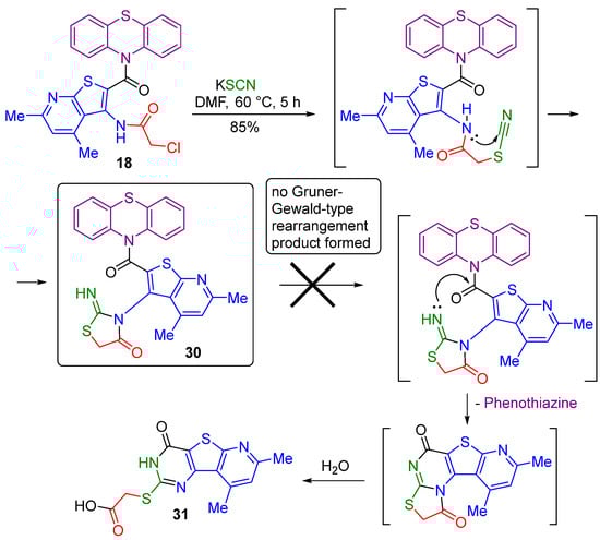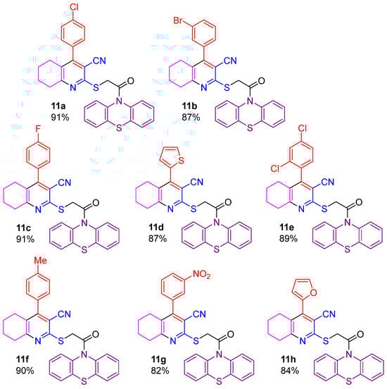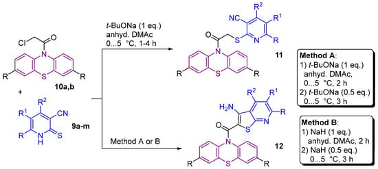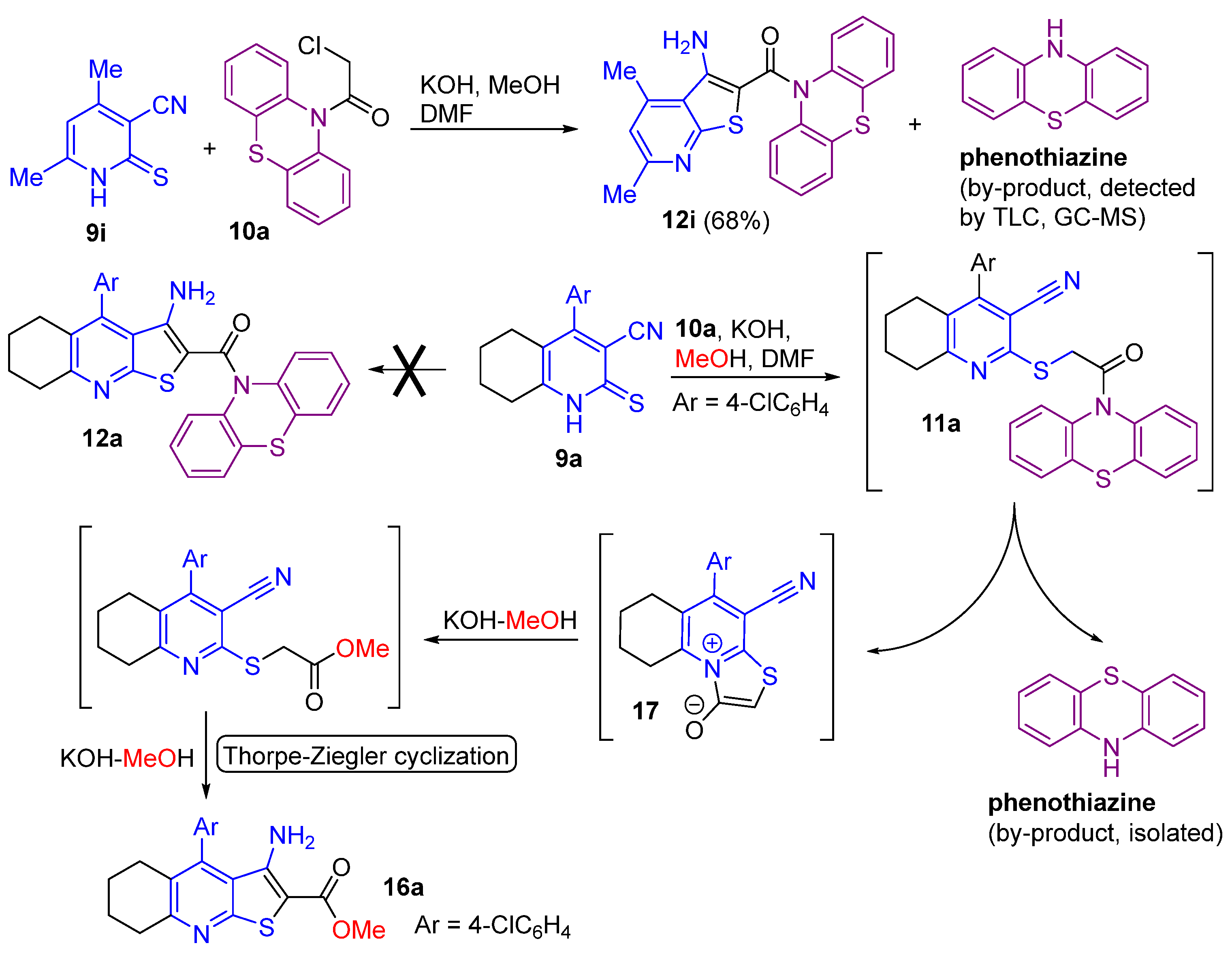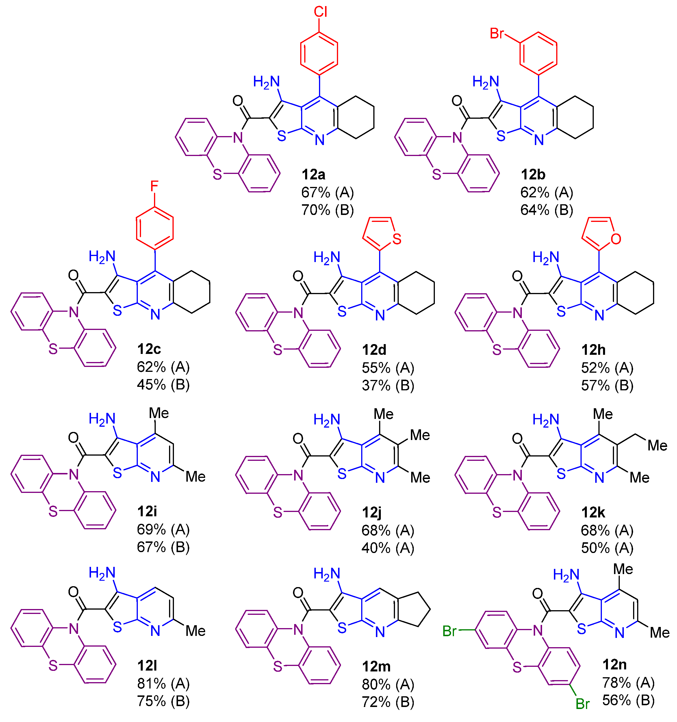 - Kindop, V.K.; Kindop, V.K.; Dotsenko, V.V.; Lukina, D.Y.; Aksenov, N.A.; Aksenova, I.V. The unexpected result of the Thorpe-Ziegler heterocyclization of N-[(3-cyanoquinolin-2-yl)thio]acetylphenothiazines promoted by KOH–CH3OH. Russ. Chem. Bull. 2025; accepted. [Google Scholar]
