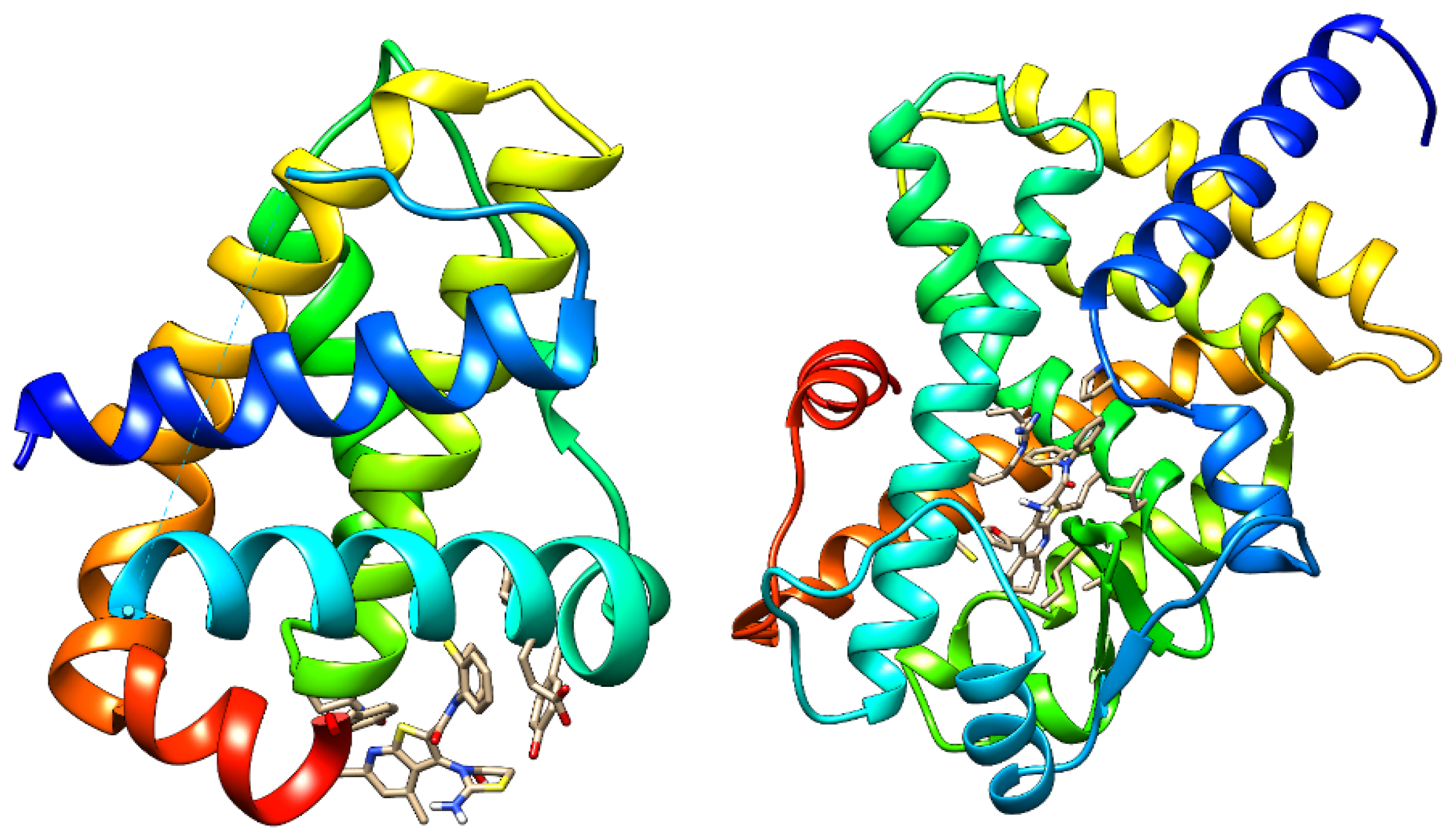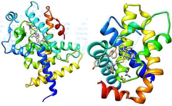 - Pettersen, E.F.; Goddard, T.D.; Huang, C.C.; Couch, G.S.; Greenblatt, D.M.; Meng, E.C.; Ferrin, T.E. UCSF Chimera—A visualization system for exploratory research and analysis. J. Comput. Chem. 2004, 25, 1605–1612. [Google Scholar] [CrossRef]