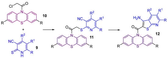 Dotsenko, V.V.; Kindop, V.K.; Kindop, V.K.; Daus, E.S.; Yudaev, I.V.; Daus, Y.V.; Bespalov, A.V.; Buryi, D.S.; Lukina, D.Y.; Aksenov, N.A.; et al. Synthesis of New Phenothiazine/3-cyanoquinoline and Phenothiazine/3-aminothieno[2,3-b]pyridine(-quinoline) Heterodimers. Int. J. Mol. Sci. 2025, 26, 9798. https://doi.org/10.3390/ijms26199798