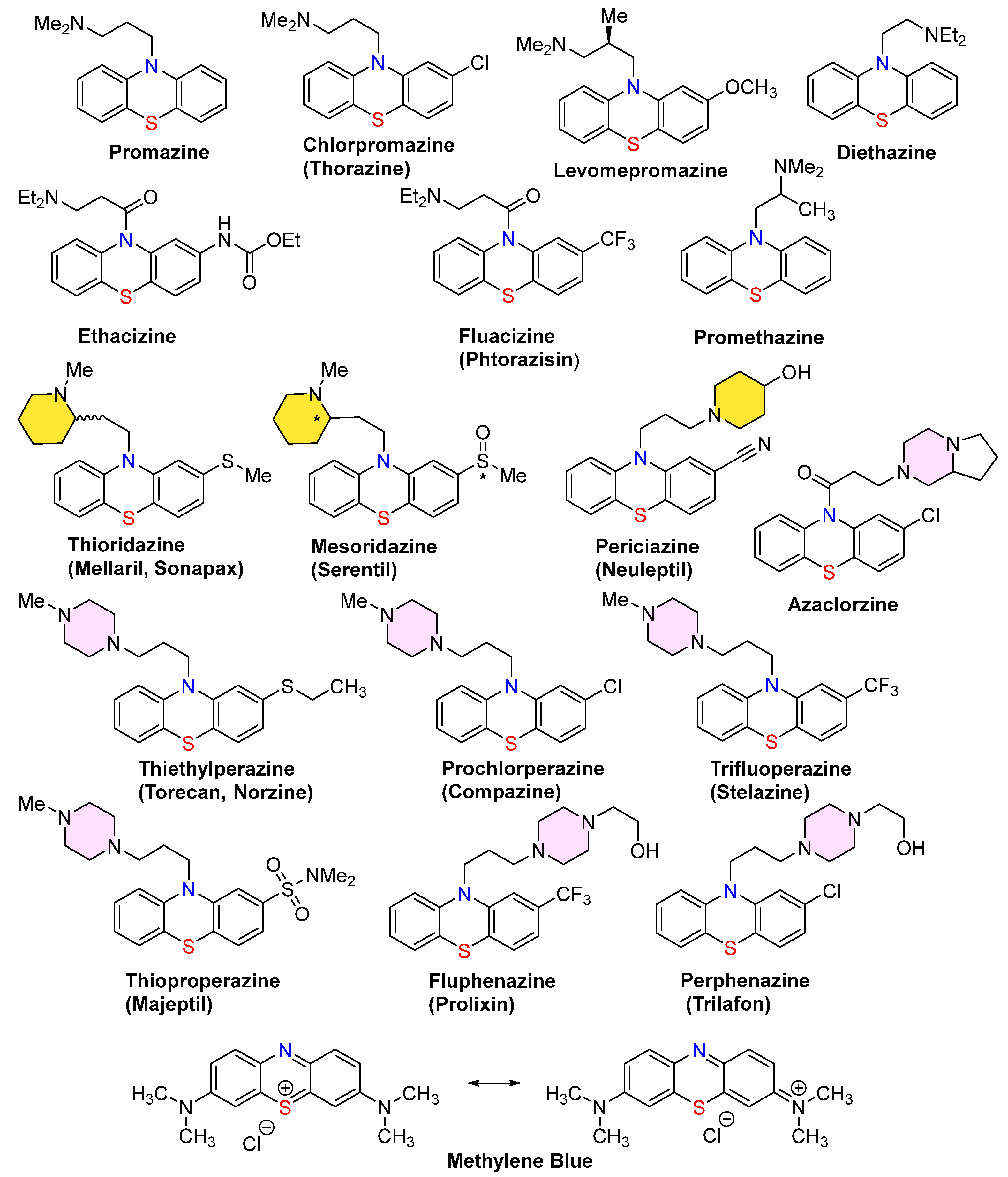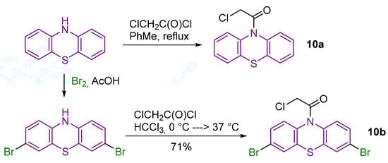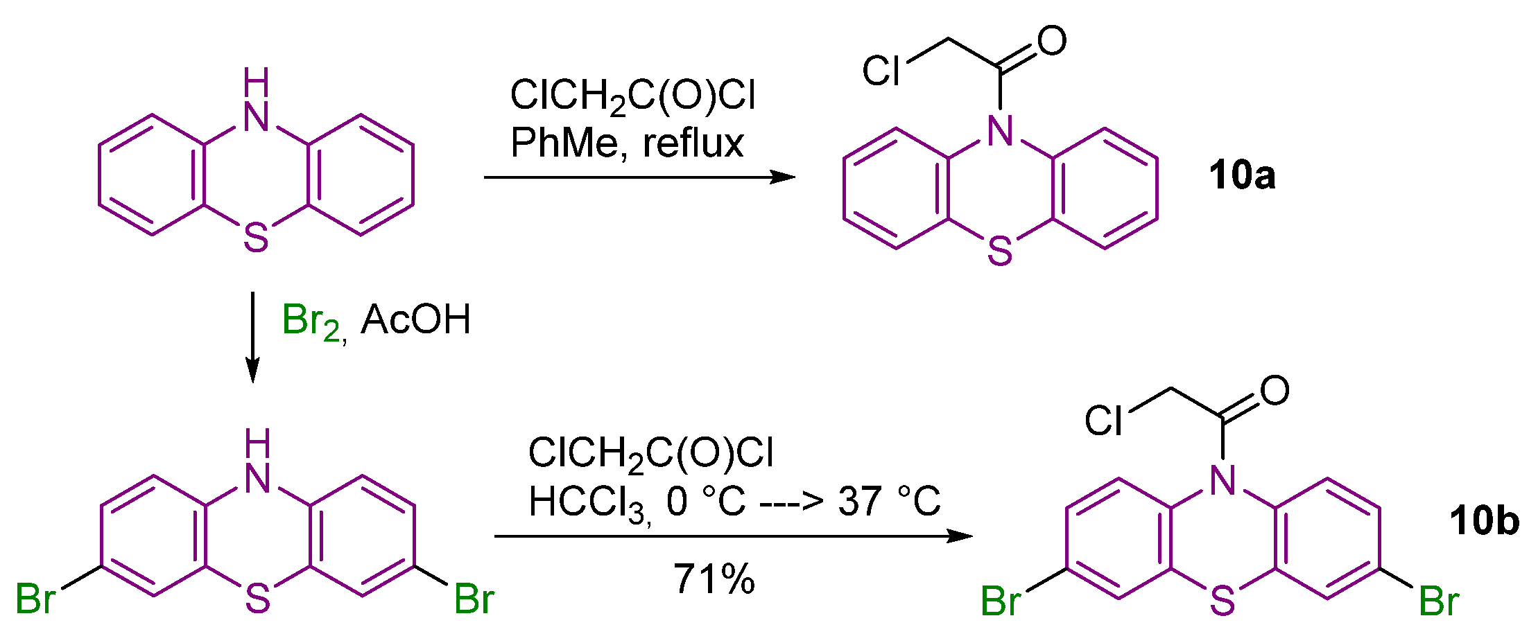 - Marcu, A.; Schurigt, U.; Müller, K.; Moll, H.; Krauth-Siegel, R.L.; Prinz, H. Inhibitory effect of phenothiazine- and phenoxazine-derived chloroacetamides on Leishmania major growth and Trypanosoma brucei trypanothione reductase. Eur. J. Med. Chem. 2016, 108, 436–443. [Google Scholar] [CrossRef]