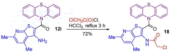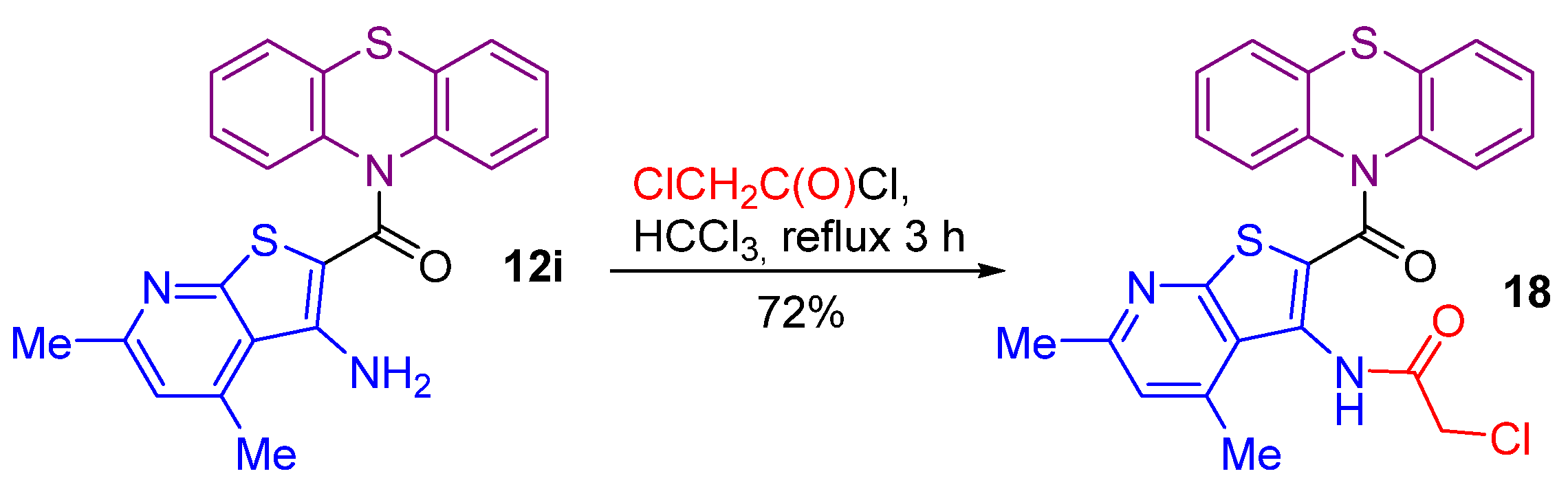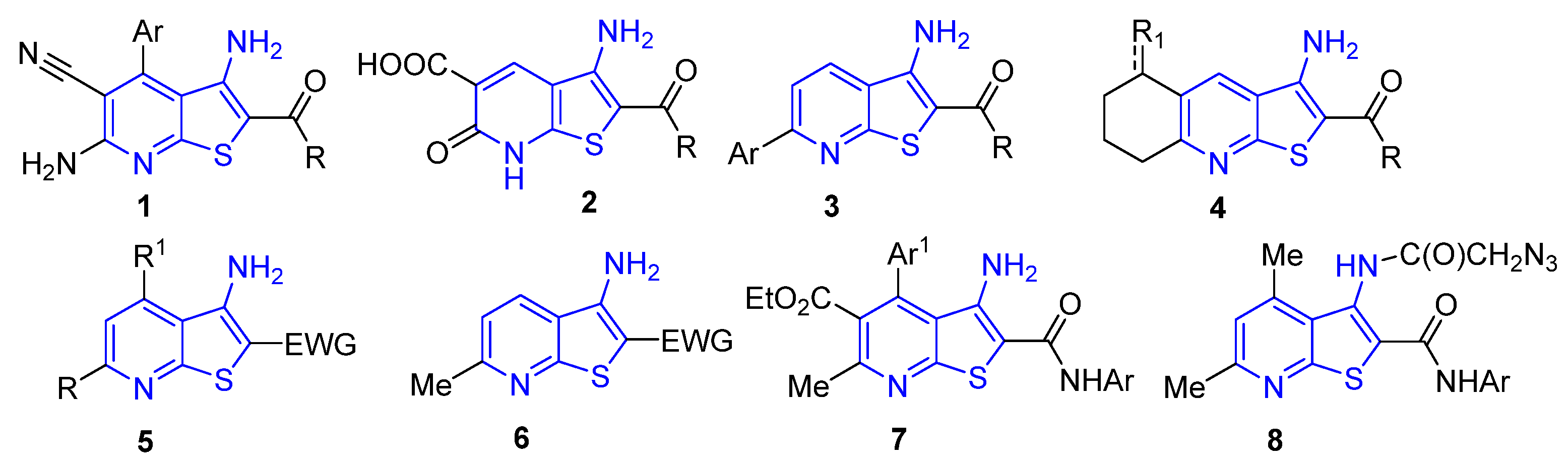 - Dotsenko, V.V.; Buryi, D.S.; Lukina, D.Y.; Stolyarova, A.N.; Aksenov, N.A.; Aksenova, I.V.; Strelkov, V.D.; Dyadyuchenko, L.V. Substituted N-(thieno[2,3-b]pyridine-3-yl)acetamides: Synthesis, reactions, and biological activity. Monatsh. Chem. 2019, 150, 1973–1985. [Google Scholar] [CrossRef]