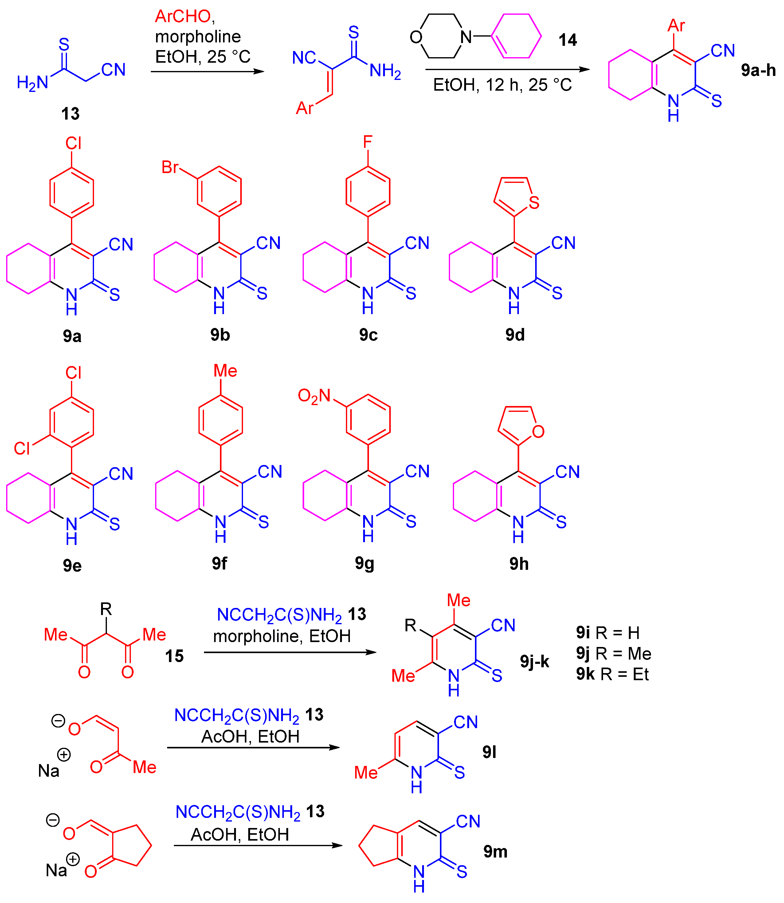 - Dotsenko, V.V.; Krivokolysko, S.G.; Polovinko, V.V.; Litvinov, V.P. On the regioselectivity of the reaction of cyanothioacetamide with 2-acetylcyclohexanone, 2-acetylcyclopentanone, and 2-acetyl-1-(morpholin-4-yl)-1-cycloalkenes. Chem. Heterocycl. Compd. 2012, 48, 309–319. [Google Scholar] [CrossRef]