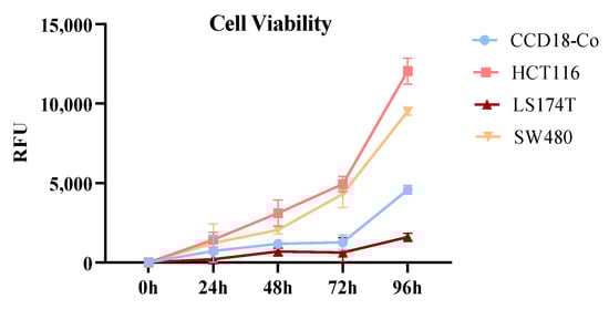 Cell proliferation of normal human colon fibroblast cell line (CCD18-Co) and colorectal cancer cell lines (HCT116, LS174T, and SW480) was analyzed. Experiments were performed in triplicate using the Deep Blue reagent (BioLegend) and Relative Fluorescence Units (RFU), following the manufacturer’s instructions. Data are presented as the mean of RFU ± SD.