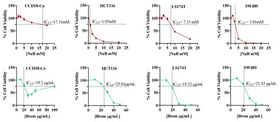 Dose–response curves showing the IC25 values (concentration causing 25% inhibition of cell viability) of Sodium Butyrate (NaB, red) and Bromelain (Brom, green) on CCD18-Co, HCT116, LS174T, and SW480 cell lines. Data were generated using GraphPad Prism version 8 and represent mean ± standard deviation from three independent experiments for each treatment and cell line.