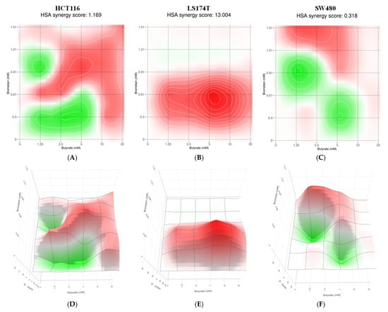 Two-dimensional (A–C) and three-dimensional (D–F) HSA synergy heatmaps generated with Synergyfinder.org show combinations of sodium butyrate (1.25–20 mM) and bromelain (10–50 µg/mL; concentrations expressed in mM) tested in three colorectal cancer cell lines: HCT116 (A,D), LS174T (B,E), and SW480 (C,F). Colors indicate the HSA δ-score, where red represents synergistic interaction and green indicates antagonism, with the scale ranging from −40 (strong antagonism) to +40 (strong synergy). Average HSA δ-scores for each cell line are shown above the corresponding 2D plots. Data represent the mean percentage of cell growth inhibition from a minimum of three independent experiments per condition.