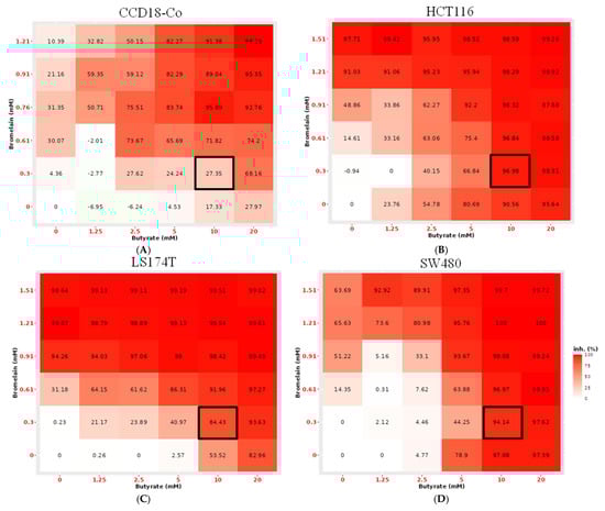 Dose–Response matrix showing the mean percentage of cell growth inhibition in the normal colon cell line CCD18-Co (A) and colorectal cancer cell lines HCT116 (B), LS174T (C) and SW480 (D) following treatment with combinations (expressed in mM) of sodium butyrate and bromelain. Analysis and visualization were performed using the SynergyFinder platform (synergyfinder.org). The black boxes indicate the optimal treatment concentration, which reduces tumor cell viability by over 80% while affecting healthy cells by only about 25%. Data represent the mean percentage of cell growth inhibition from a minimum of three independent experiments per condition.