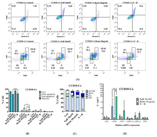 Following the identification of the optimal dose, the cytotoxic effect on normal colon cells (CCD18-Co) was further evaluated (Figure 10). At this concentration, cell viability remained at ~75%, with significant differences observed in early apoptosis compared to untreated controls (Figure 10A,B). Cell cycle analysis revealed a reduction in the proportion of cells in the S phase in the NaB and combination groups compared with bromelain alone and the control group (Figure 10A,C). Additionally, combination treatment induced a marked increase in CDH1 gene expression (Figure 10D).