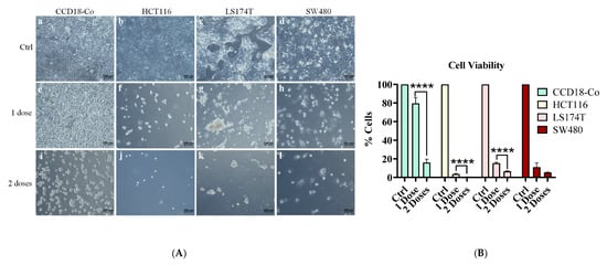 (A) Sequential treatment of a normal human colonic fibroblast cell line CCD18-Co (a,e,i) and colorectal cancer cell lines HCT116 (b,f,j), LS174T (c,g,k), and SW480 (d,h,l) cultured in conventional medium (Ctrl), after 72 h of combined treatment with 10 mM sodium butyrate and 10 µg/mL bromelain (1 dose), and after the first treatment followed by a second dose at 144 h (2 doses). (B) Cell viability assessed using Deep Blue after the first and second doses of the combination treatment (10 mM sodium butyrate + 10 µg/mL bromelain) in CCD18-Co, HCT116, LS174T and SW480 cell lines. Data are presented as mean ± SD from at least three independent experiments. Statistical analysis was performed using one-way ANOVA followed by Tukey’s Post Hoc test. Significance: * p < 0.05; ** p < 0.01; *** p < 0.001; **** p < 0.0001; α = 0.05.