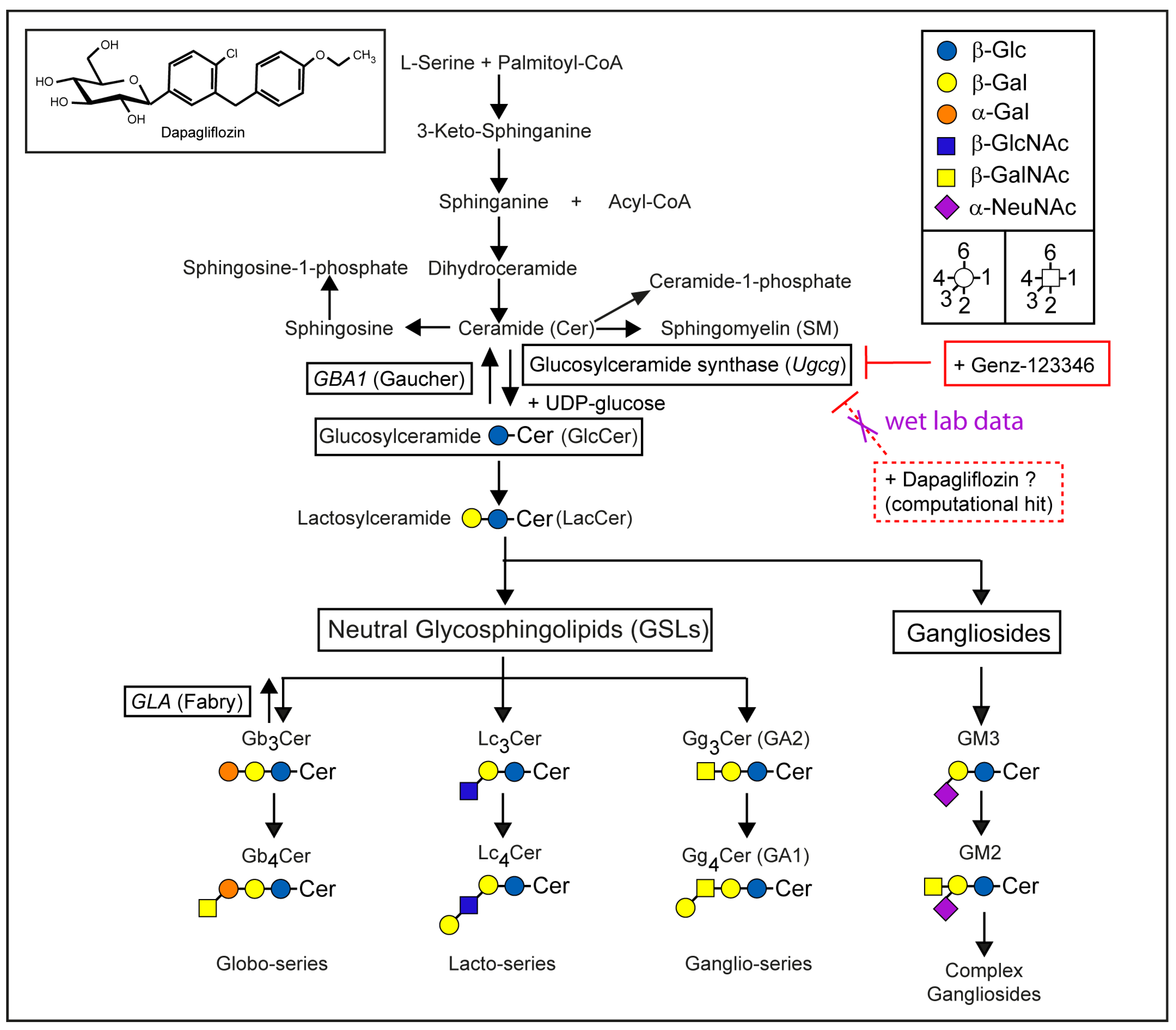 Dapagliflozin is a selective, potent, and reversible inhibitor of the sodium-glucose co-transporter 2 (SGLT2) [1]. It is widely used in the treatment of type 2 diabetes mellitus [1,2,3] and has also been reported to exert beneficial effects on cardiac function [4,5]. More recently, computational analyses have suggested dapagliflozin as a potential candidate for targeting glucosylceramide synthase (GCS) in glycosphingolipid (GSL) storage disorders [6]. However, no direct in vitro evidence of its inhibitory activity towards GCS was provided. The primary aim of our investigations was therefore to assess whether dapagliflozin indeed has the potential to inhibit GSL synthesis.
