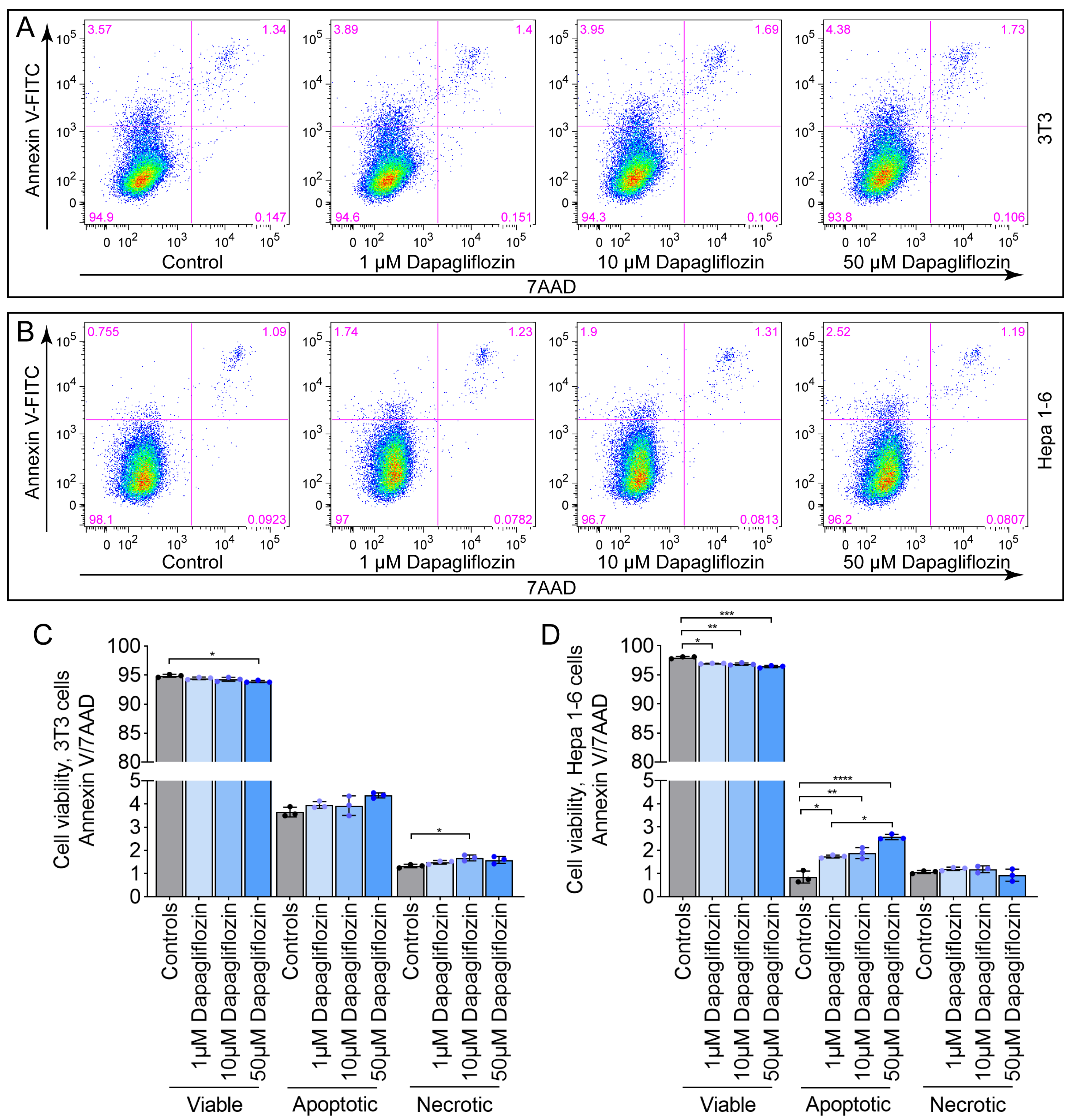 Figure 3. Dapagliflozin has no significant effect on apoptosis or necrosis in 3T3 and Hepa 1-6 cells. (AD) Annexin V/7-AAD flow cytometric analysis following treatment with various concentrations of dapagliflozin. (A) Representative FACS plots for 3T3 cells; (B) representative FACS plots for Hepa 1-6 cells. (C) Quantification for 3T3; (D) quantification for Hepa 1-6. Increasing cell density in the FACS images is shown by blue-, green-, yellow-, and red colors. Data represent one of two independent experiments; n = 3 per condition. Bar graphs show mean ± SD. One-way ANOVA: *, p ≤ 0.05; **, p < 0.01; ***, p < 0.001; ****, p < 0.0001.