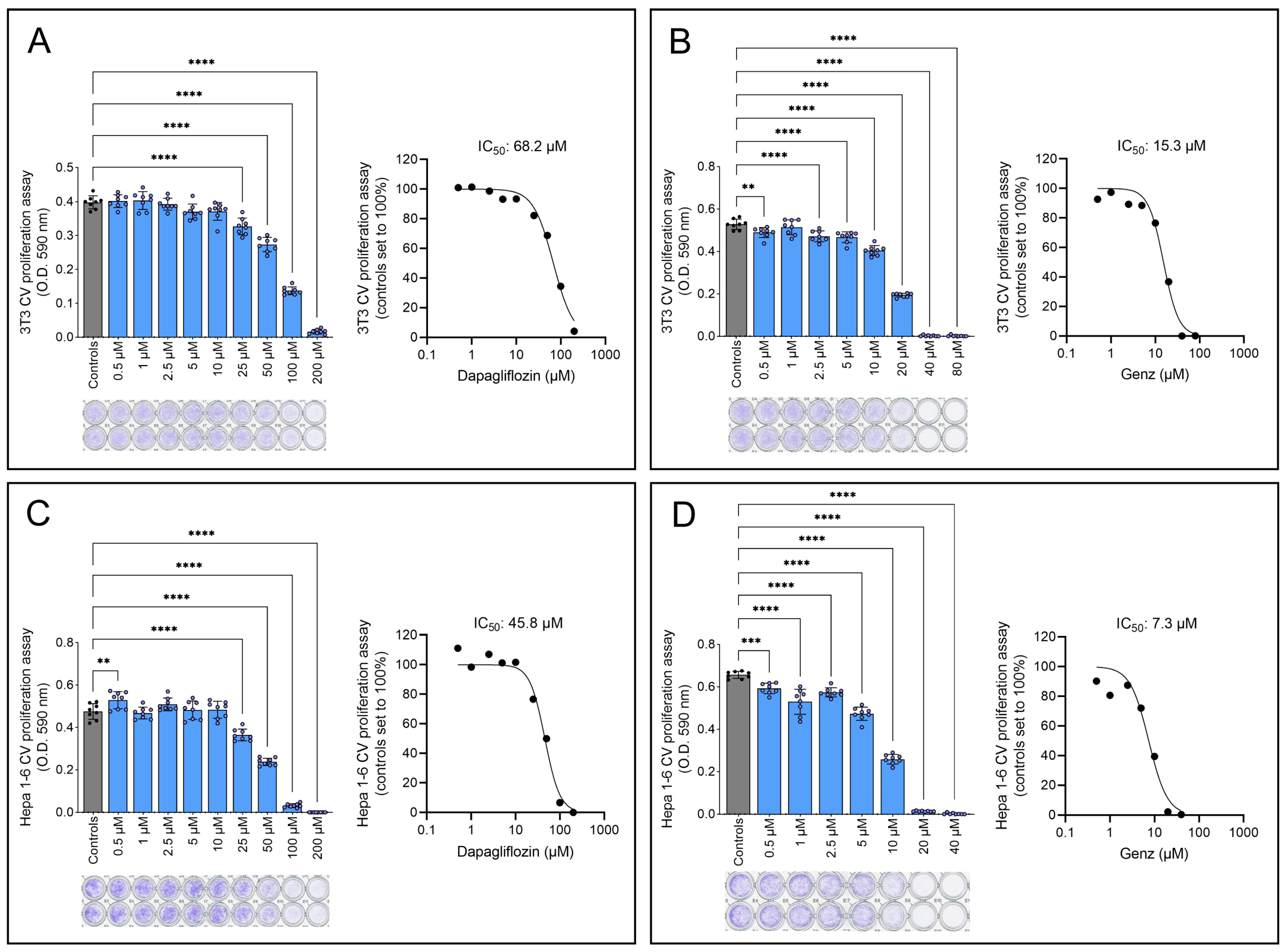 Figure 4. IC50 determination for dapagliflozin and Genz-123346 in 3T3 and Hepa 1-6 cell proliferation assays. (A,B) Effects of dapagliflozin (A) and the GCS inhibitor Genz-123346 (B) on 3T3 proliferation. (C,D) Effects of dapagliflozin (C) and Genz-123346 (D) on Hepa 1-6 proliferation. Cells were seeded in 96-well plates, allowed to adhere overnight, treated with inhibitors for 48 h, fixed with paraformaldehyde, and stained with crystal violet (CV). Shown is one representative of two experiments. (Upper left) Dose–response curves; each column represents the mean of eight wells ± SD; one-way ANOVA: **, p < 0.01; ***, p < 0.001; ****, p < 0.0001; (upper right) calculated IC50 values; (lower left) representative images of CV-stained microtiter plate rows.