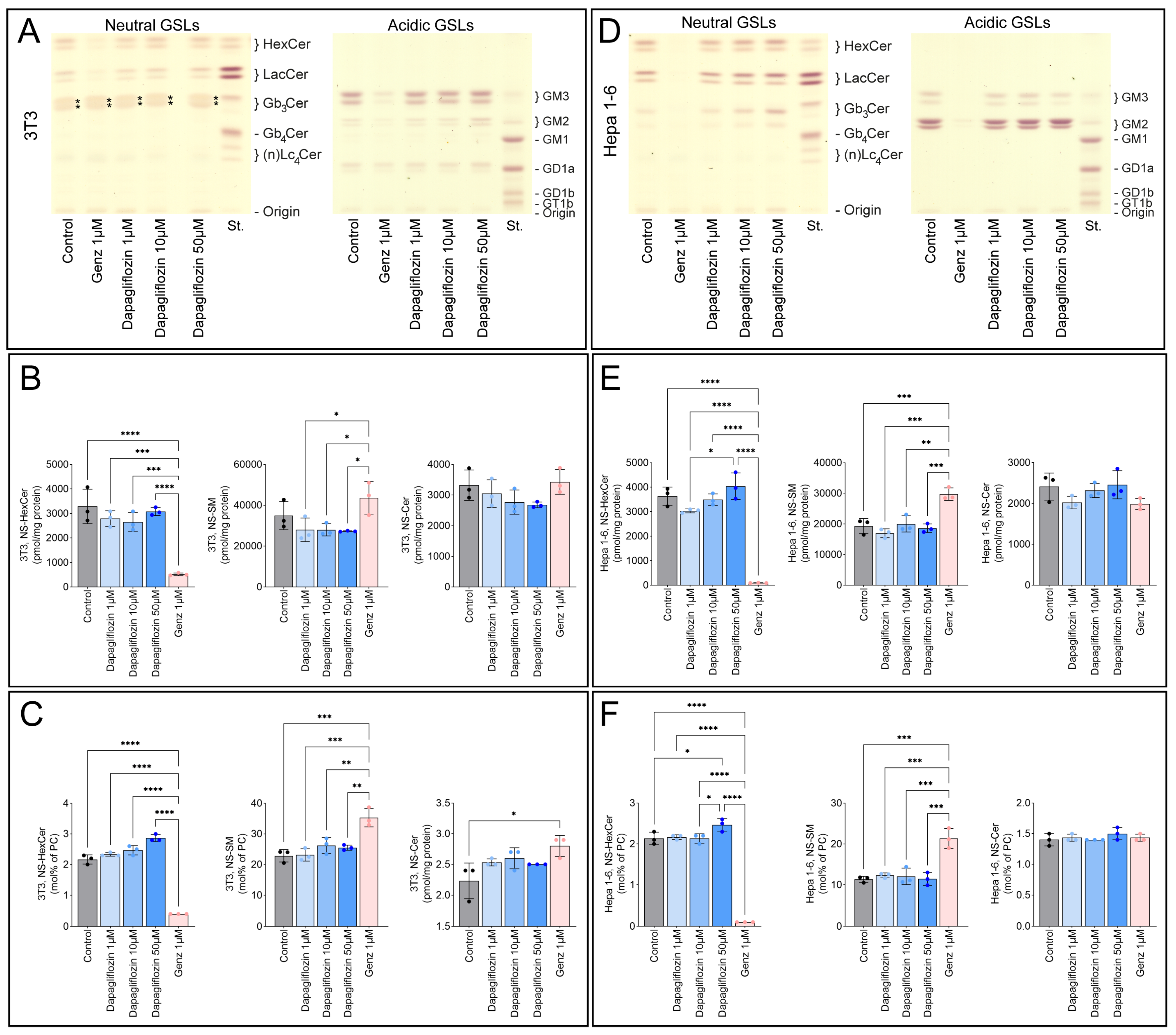 Figure 5. Dapagliflozin does not inhibit GSL synthesis. 3T3 cells (A): thin layer chromatography (TLC); (B,C): MS quantification) and Hepa 1-6 cells (D): TLC; (E,F): MS quantification) were treated with 1, 10, or 50 µM dapagliflozin or 1 µM Genz-123346 for six days (n = 3). Cells were harvested, spiked with internal standards, extracted, and analyzed by MS/MS. Hexosylceramide (HexCer/GlcCer), sphingomyelin (SM), and ceramide (Cer) were quantified relative to protein content (B,E) or internal phosphatidylcholine (PC) (mol% of PC) (C,F). Bar graphs show mean ± SD. One-way ANOVA: *, p ≤ 0.05; **, p < 0.01; ***, p < 0.001; ****, p < 0.0001. For TLC (A,D), pooled GSLs from three samples were separated into neutral and acidic (ganglioside) fractions, and material corresponding to 200 µg protein was loaded on TLC plates, developed, and stained.