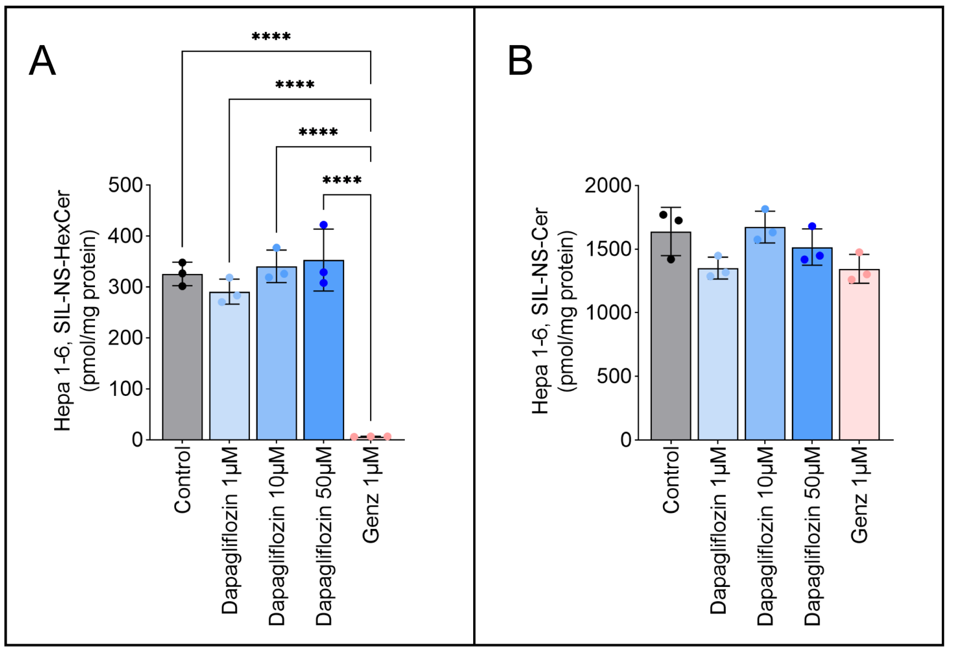 Figure 6. Dapagliflozin does not inhibit GSL neo-biosynthesis in Hepa 1-6 cells. Cells were pretreated with 1, 10, or 50 µM dapagliflozin or 1 µM Genz-123346 for six days. Stable isotope GSL labeling (SIL) was performed with 500 µM 13C3, 15N-serine for 2 h in 1% serum-containing medium (n = 3). Cells were harvested, spiked with internal standards, extracted, and analyzed by MS/MS. HexCer (A) and Cer (B) were quantified relative to protein content. Bar graphs show mean ± SD. One-way ANOVA: ****, p < 0.0001.