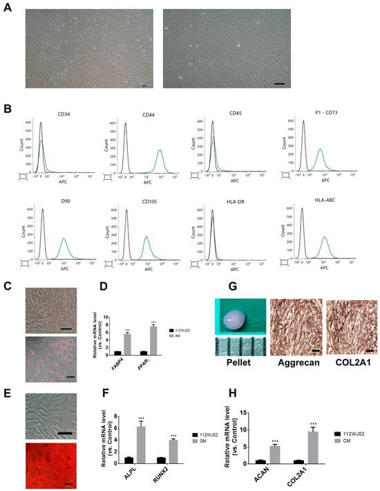 Characterization of human umbilical cord-derived mesenchymal stem cells (hUCMSCs). (A) Morphology of cultured hUCMSCs observed under a light microscope at early passages, showing typical fibroblast-like spindle-shaped morphology. Scale bar: 100 µm. (B) Flow cytometry analysis of surface markers. hUCMSCs were positive for CD44, CD73, CD90, CD105, and HLA-ABC, and negative for hematopoietic markers CD34, CD45, and HLA-DR, consistent with the MSC phenotype. The green line represents cells stained with specific APC-conjugated antibodies, indicating positive expression of the corresponding surface markers. (C) The upper panel showed no staining control. The lower panel showed Oil Red O staining showing lipid droplet accumulation after adipogenic induction. Scale bar = 100 μm. (D) Quantitative RT-PCR demonstrating elevated expression of adipogenic markers FABP4 and PPARγ in adipogenic medium (AM) compared to that in control. (E) The upper panel showed no staining control. The lower panel showed Alizarin Red S staining showing calcium deposition after osteogenic induction. Scale bar = 100 μm. (F) qRT-PCR analysis of osteogenic markers ALPL and RUNX2 expression in osteogenic medium (OM) compared to that in control. (G) The left panel shows pellet formation after 21 days of chondrogenesis (Scale bar = 1mm). The middle and right panels showed immunohistochemical staining of chondrogenic pellets showing positive staining for aggrecan and COL2A1. Scale bar = 100 μm. (H) qRT-PCR showing increased ACAN and COL2A1 mRNA expression in chondrogenic medium (CM) compared to that in the control. Data are presented as mean ± SEM; *** p < 0.001 vs. control.