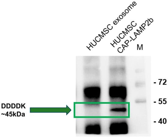 As shown in Figure 2, Western blot using an anti-FLAG (DDDDK) antibody confirmed expression of the CAP-LAMP2b fusion protein in both hUCMSCs and their exosomes, with a specific band at approximately 45 kDa. This band appeared only in CAP-LAMP2b-transfected hUCMSCs and corresponding exosomes, but not in untransfected exosome controls, indicating efficient incorporation of the FLAG-tagged construct into exosomal cargo.