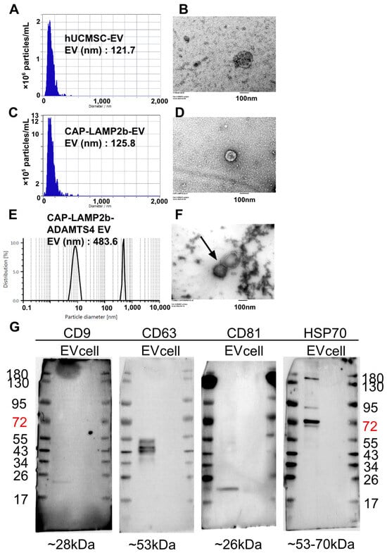 Characterization of extracellular vesicles (EVs) derived from hUCMSC, CAP-LAMP2b-expressing hUCMSCs, and CAP-LAMP2b-ADAMTS4 EVs. (A,C,E) Nanoparticle tracking analysis (NTA) of hUCMSC-EVs, CAP-LAMP2b-EVs, and CAP-LAMP2b-ADAMTS4 EVs showing average particle sizes of 121.7 nm, 125.8 nm, and 483.6 nm, respectively. (B,D,F) Transmission electron microscopy (TEM) images demonstrating the typical cup-shaped morphology of isolated EVs from hUCMSC-EVs. Scale bar = 100 nm. (B), CAP-LAMP2b-EVs (D), and CAP-LAMP2b-ADAMTS4 EVs (arrow) (F). (G) Western blot analysis confirming the presence of established EV markers (CD9, CD63, CD81, and HSP70) in both EVs and EV-producing cells. Bands appear at the expected molecular weights, validating EV identity: ~28 kDa (CD9), ~53 kDa (CD63), ~26 kDa (CD81), and ~53–70 kDa (HSP70). The number is molecular weight of the proteins.