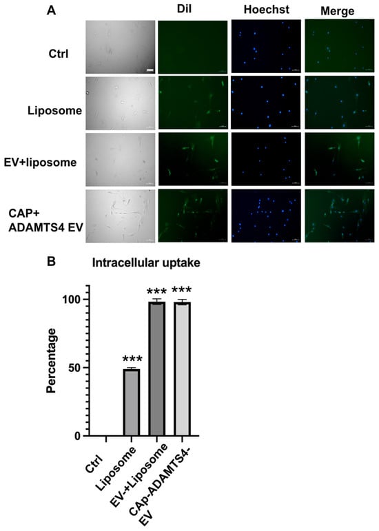 As shown in Figure 4, CAP-modified hybrid EVs exhibited enhanced cellular uptake. Fluorescence microscopy revealed stronger DiI signals in cells treated with hUCMSC-EV + liposome and CAP-ADAMTS4 EV compared to liposome-treated or untreated controls, indicating greater internalization. Quantitative analysis confirmed that both hUCMSC-EV + liposome and CAP-ADAMTS4 EV groups displayed significantly higher intracellular uptake (p < 0.001) than liposome controls, demonstrating that hUCMSC-EV + liposome and CAP-ADAMTS4 EV effectively enhanced EV delivery to target cells.