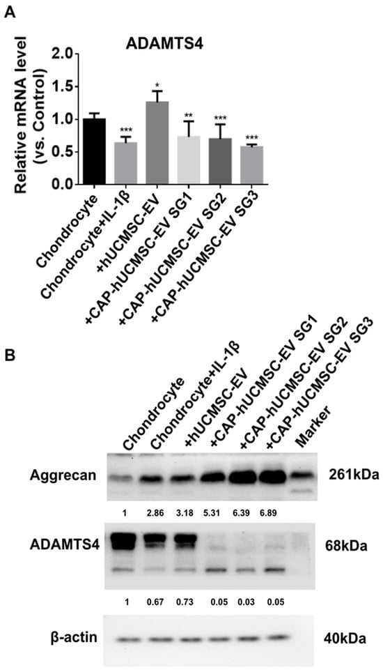Effects of CAP-EV treatment on ADAMTS4 expression and cartilage matrix proteins in IL-1β-stimulated chondrocytes. (A) Quantitative real-time PCR of ADAMTS4 mRNA levels under different treatments: untreated control, IL-1β (10 ng/mL for 48 h), hUCMSC-EV SG3, CAP-hUCMSC-EV SG1, CAP-hUCMSC-EV SG2, and CAP-hUCMSC-EV SG3 (for 24 h). Data are presented as mean ± SEM (n = 3). * p < 0.05, ** p < 0.01, *** p < 0.001 vs. IL-1β group. (B) Western blot of aggrecan (~261 kDa), ADAMTS4 (~68 kDa), and β-actin (40 kDa). Red arrowheads indicate target protein bands.
