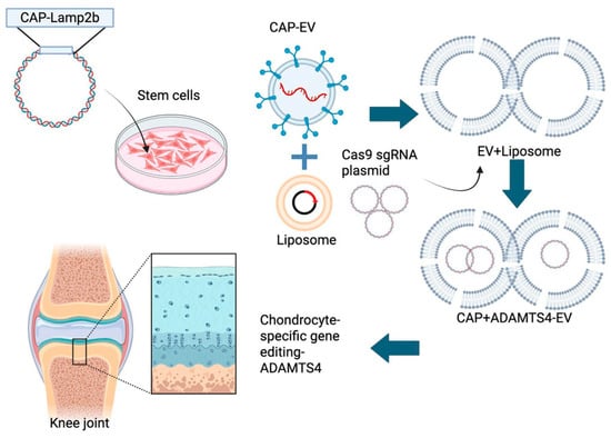 In this study, we demonstrated that CAP-LAMP2b-engineered EVs derived from hUCMSCs can efficiently deliver CRISPR-Cas9 plasmids targeting ADAMTS4. These engineered EVs successfully reduced ADAMTS4 expression and preserved aggrecan levels in IL-1β-treated chondrocytes, thereby mitigating extracellular matrix degradation under inflammatory conditions. Our findings provide proof of concept that gene-modified EVs represent a promising therapeutic platform for cartilage repair. Based on these results, we recommend that future research should focus on validating the efficacy and safety of this strategy using in vivo OA models, optimizing delivery efficiency, and exploring the translational potential of engineered EVs in regenerative medicine.