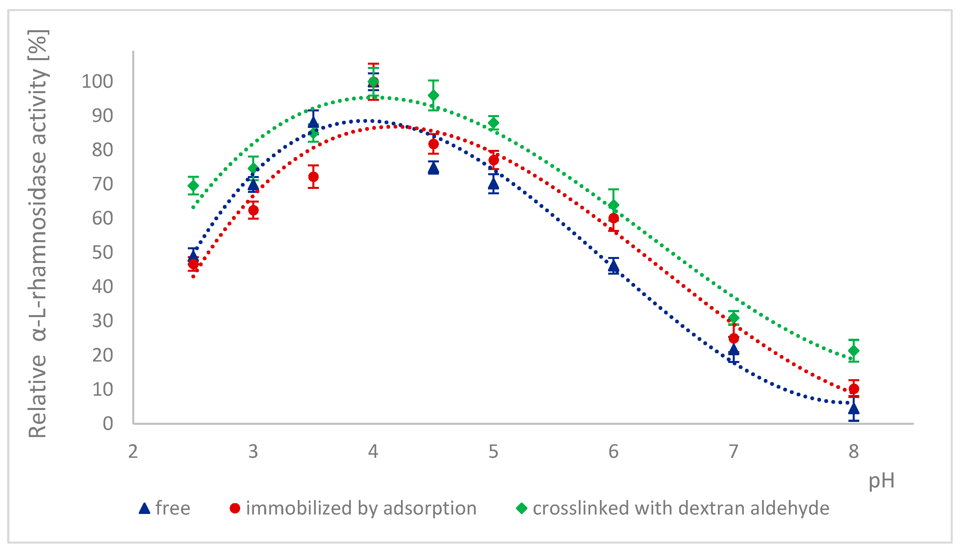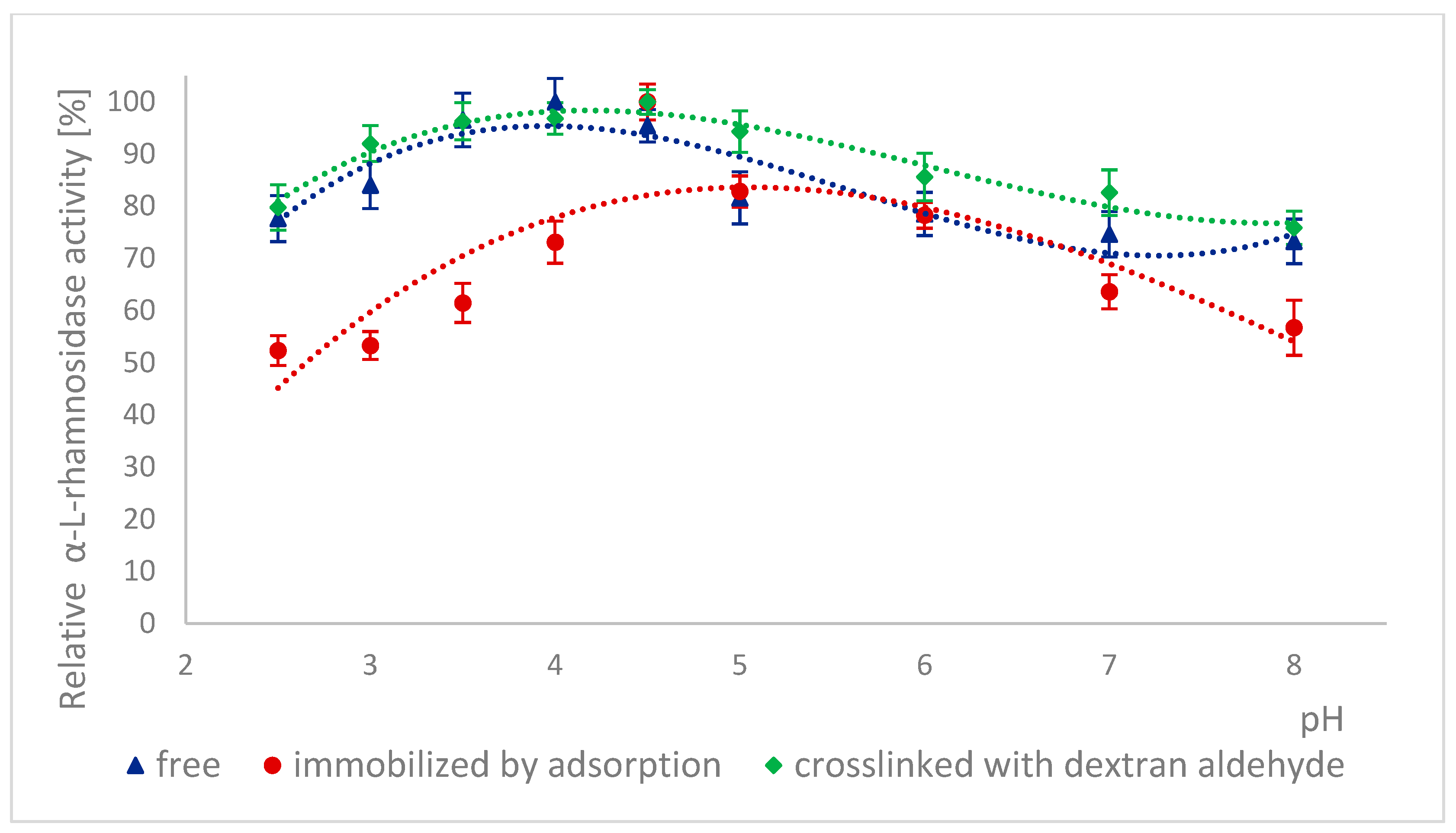 Almost across the entire pH range analyzed, i.e., from 2.5 to 8.0, α-L-rhamnosidase from stabilized naringinase exhibits higher activity than the free and immobilized form of the biocatalyst under investigation. The activity of β-D-glucosidase from naringinase stabilized with dextran aldehyde was highest in the pH range from 3.5 to 5. Above pH 5, the highest activity was exhibited by β-D-glucosidase immobilized by adsorption. The high activity of the crosslinked α-L-rhamnosidase and β-D-glucosidase at low pH indicates the possibility of using such an immobilized enzyme in acidic medium as citrus juice.