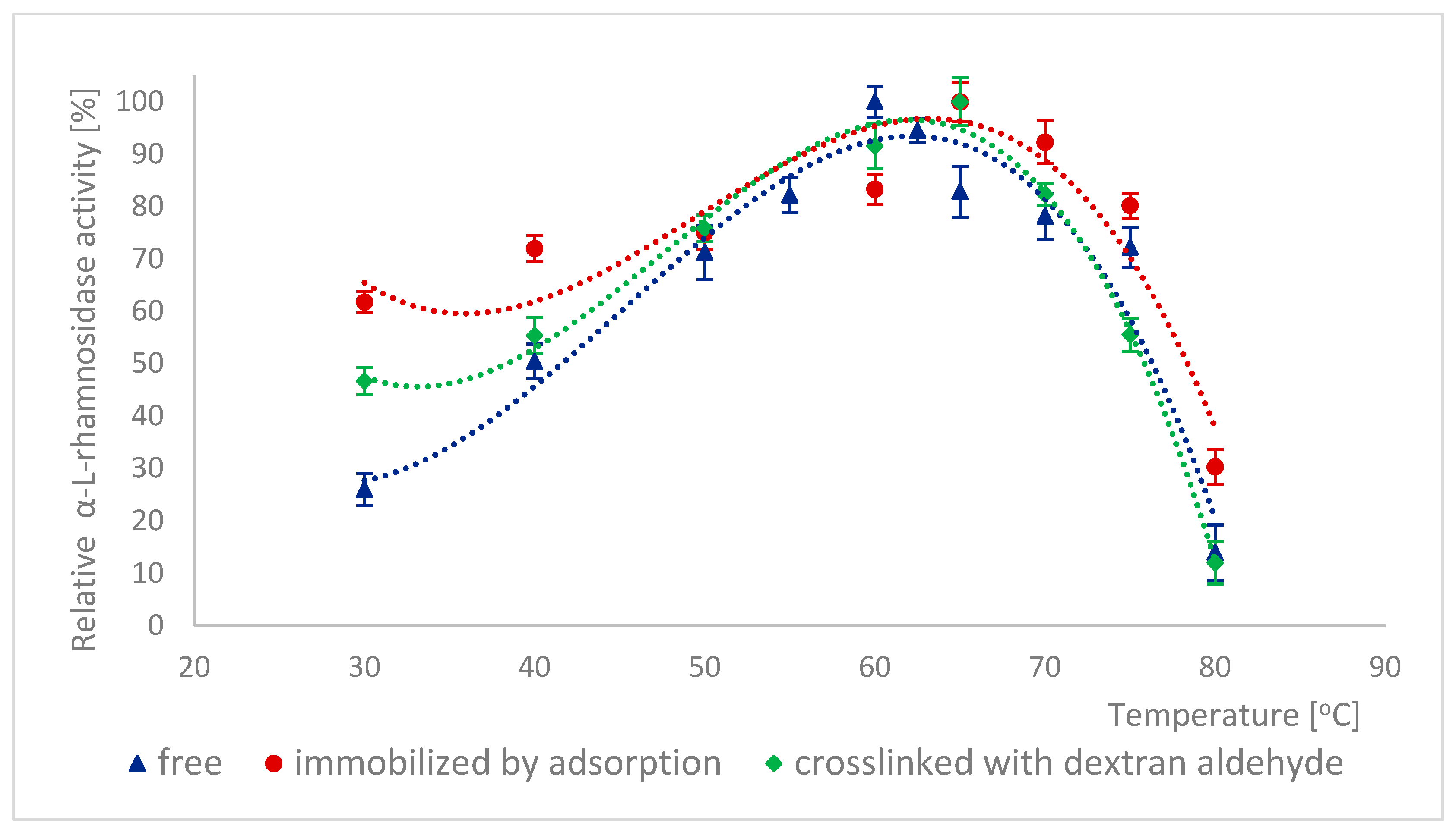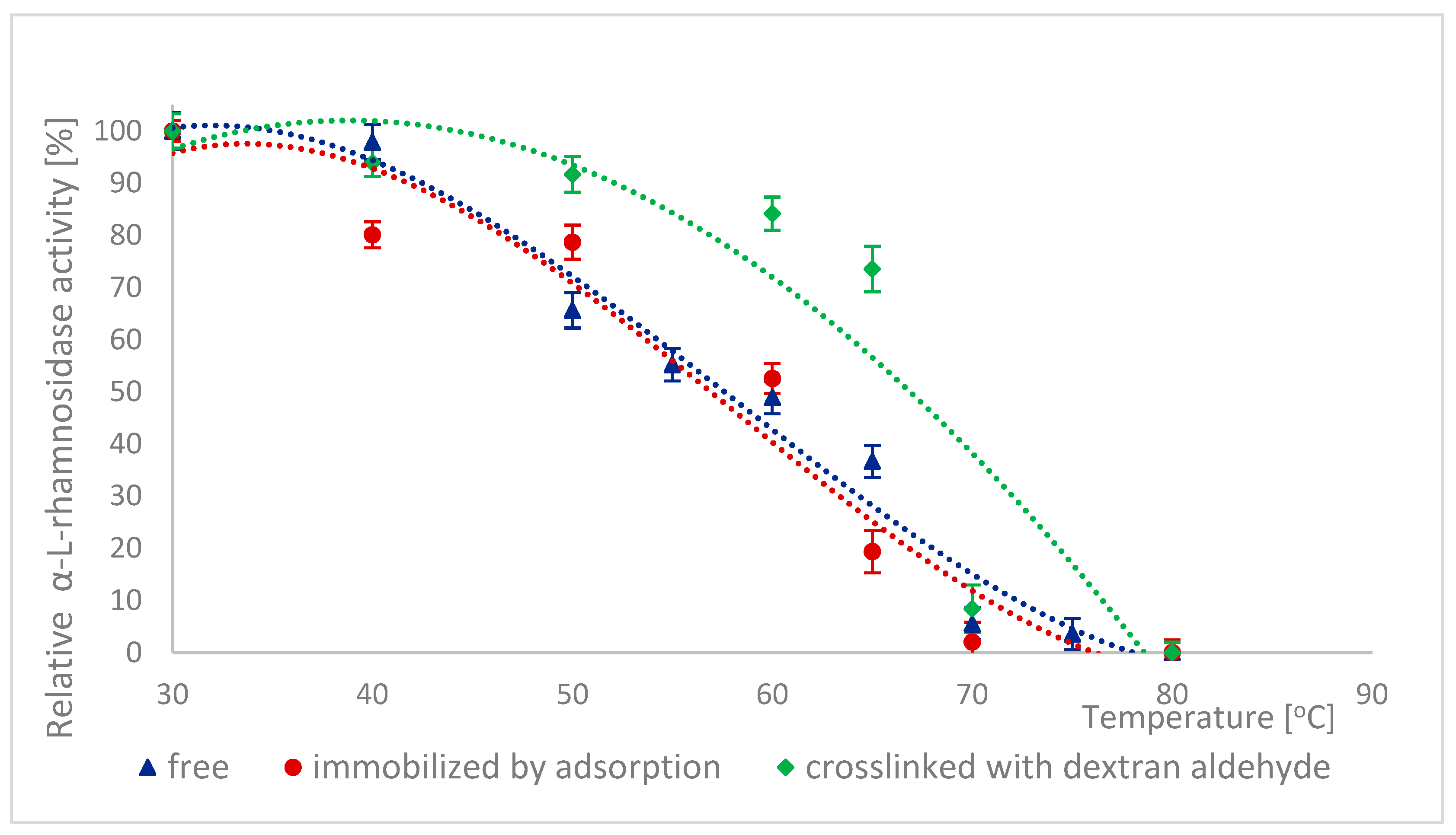 α-L-rhamnosidase was the most stable among the tested enzyme forms, a subunit of immobilized and dextran aldehyde-stabilized naringinase. It is worth noting that the rate of decrease in its activity increased only after exceeding a temperature of 60 °C. α-L-rhamnosidase from naringinase bound with dextran aldehyde was therefore thermally stable at temperatures between 30 and 60 °C.