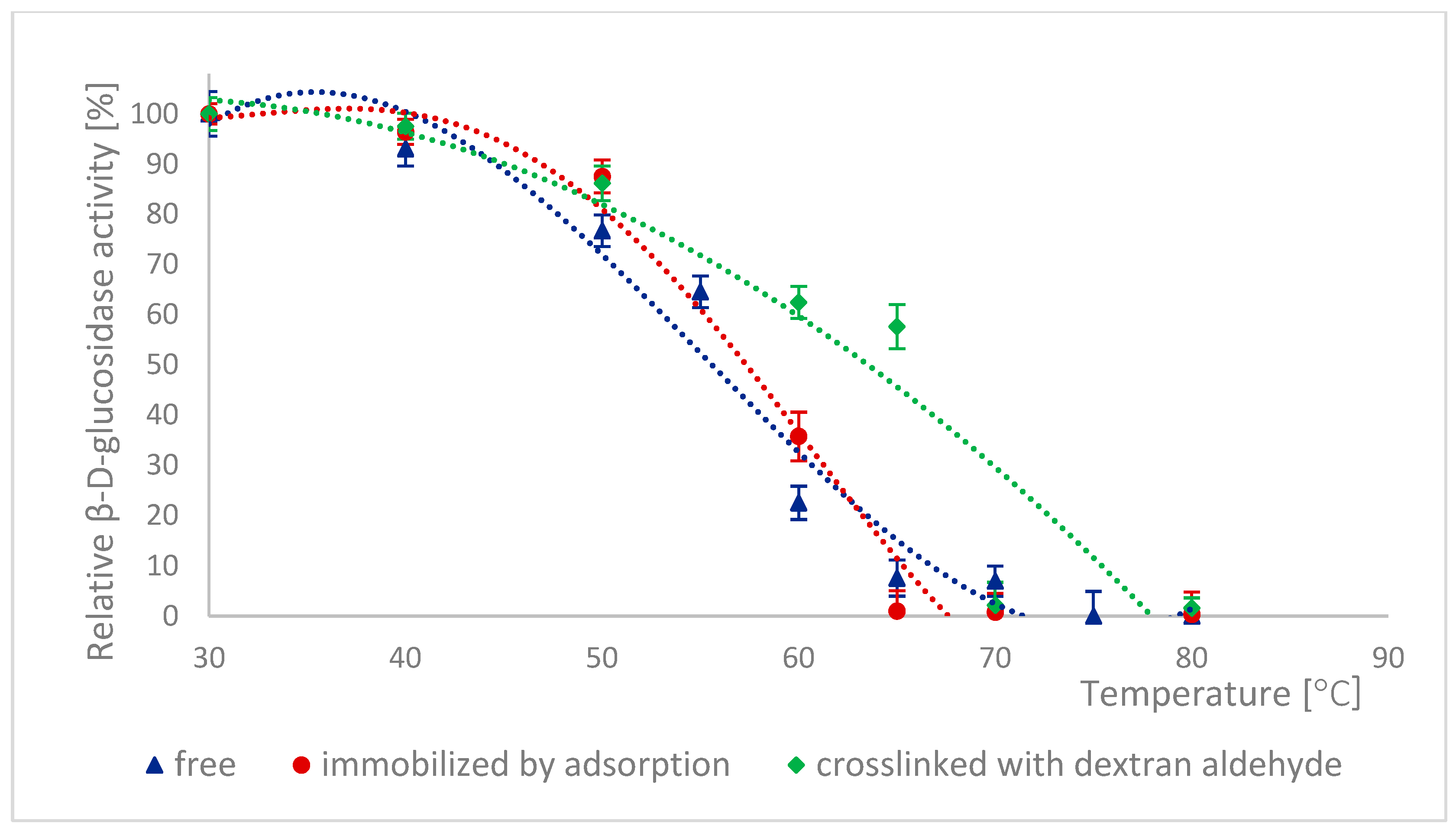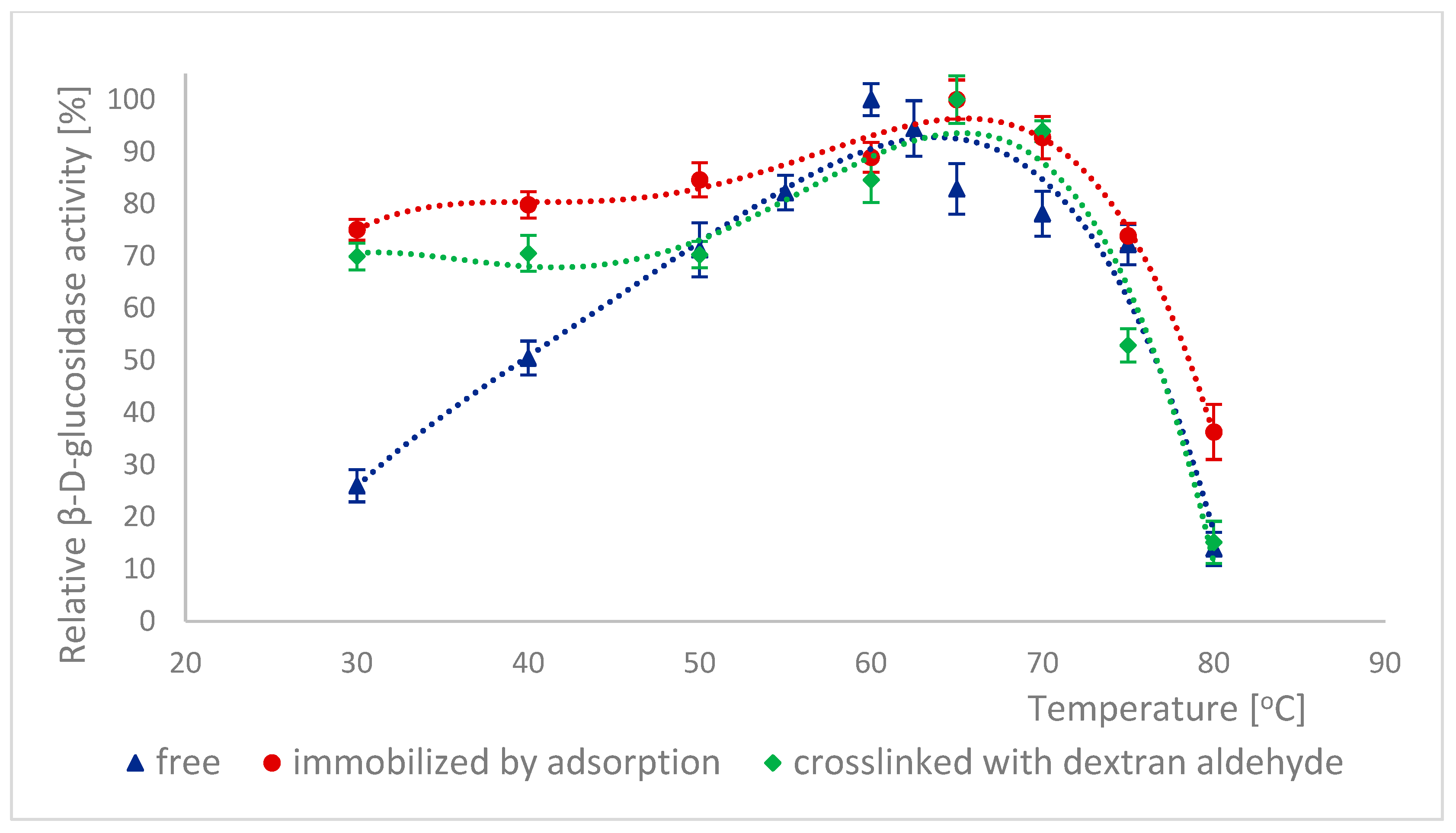 Thermal inactivation of enzymes is often a significant problem in biotechnological processes. The effect of temperature on the activity of different forms of α-L-rhamnosidase is shown in Figure 5. 100% activity for free α-L-rhamnosidase was defined as the activity at 60 °C, which was 124.61 ± 6.35 μmol·min−1·g−1. 100% activity for immobilized and stabilized α-L-rhamnosidase was defined as the activity at 65 °C, which was, respectively, 6.41 ± 0.16 μmol·min−1·g−1 and 6.71 ± 0.08 μmol·min−1·g−1. For β-D-glucosidase, such relationships are shown in Figure 6. 100% activity for free β-D-glucosidase was defined as the activity at 60 °C, which was 608.88 ± 28.91 μmol·min−1·g−1. 100% activity for immobilized and stabilized α-L-rhamnosidase was defined as the activity at 65 °C, which was 3.04 ± 0.07 μmol·min−1·g−1 and 4.30 ± 0.11 μmol·min−1·g−1 respectively. In many cases, immobilization reduces the temperature sensitivity of biocatalysts. The method of immobilization and cross-linking of α-L-rhamnosidase and β-D-glucosidase with dextran aldehyde increased the temperature at which these enzymes achieve their highest activity by 5 °C compared to their free forms (Figure 5 and Figure 6). Furthermore, the activity of both immobilized enzyme forms also increased in the temperature range of 30–45 °C. Changes in their conformation likely caused the modification of the activity profiles of α-L-rhamnosidase and β-D-glucosidase due to immobilization and cross-linking. This change in the optimal temperature of the enzymes increases their potential for use in biotechnological processes. The differences in activity at optimal temperatures of free and immobilized subunits were statistically significant.
