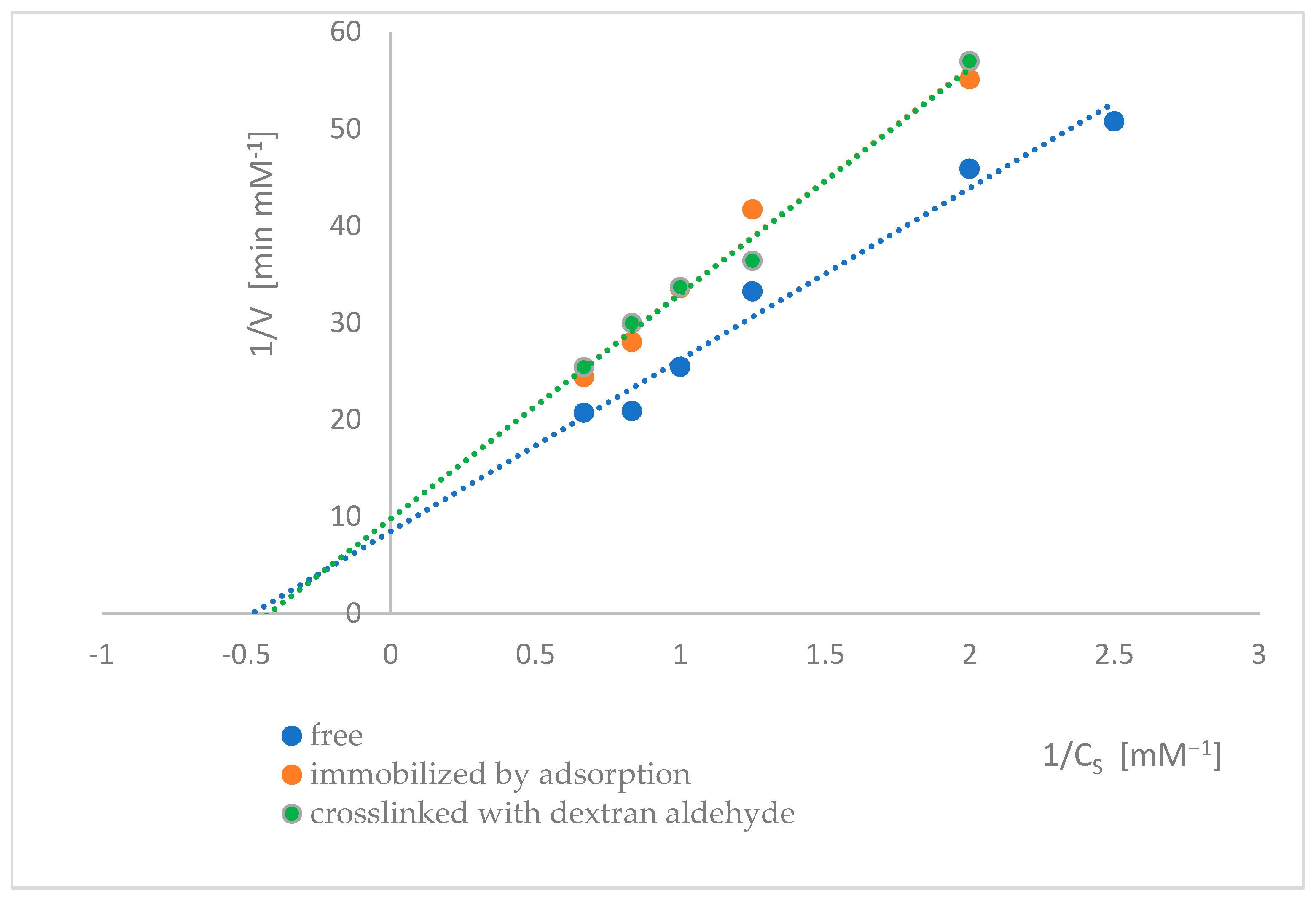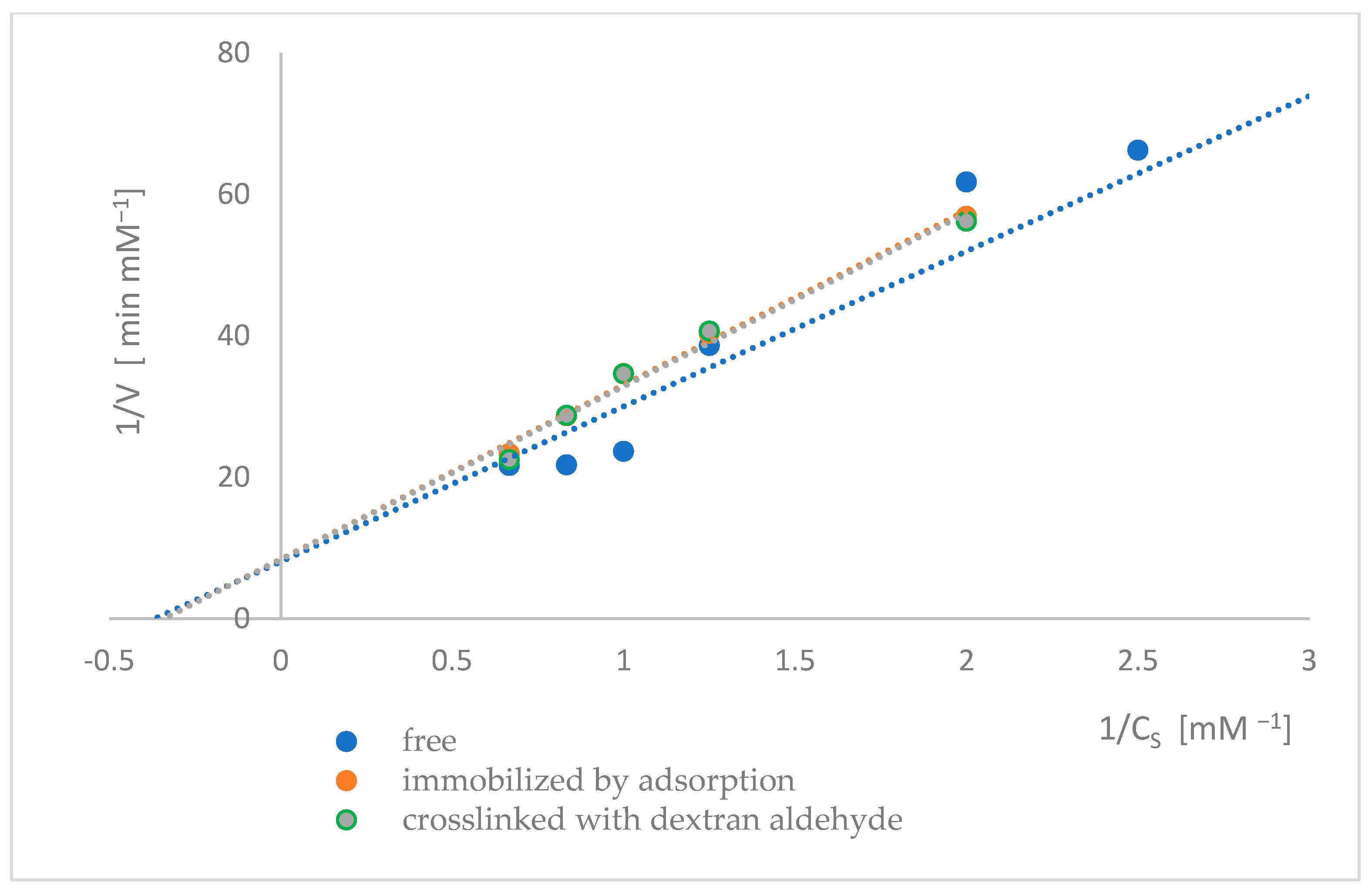 As a result of immobilization of the tested biocatalyst, the maximum reaction rate of α-L-rhamnosidase decreased slightly. The binding of immobilized naringinase with dextran aldehyde did not significantly affect the maximum reaction rate of α-L-rhamnosidase compared to the enzyme immobilized by adsorption.