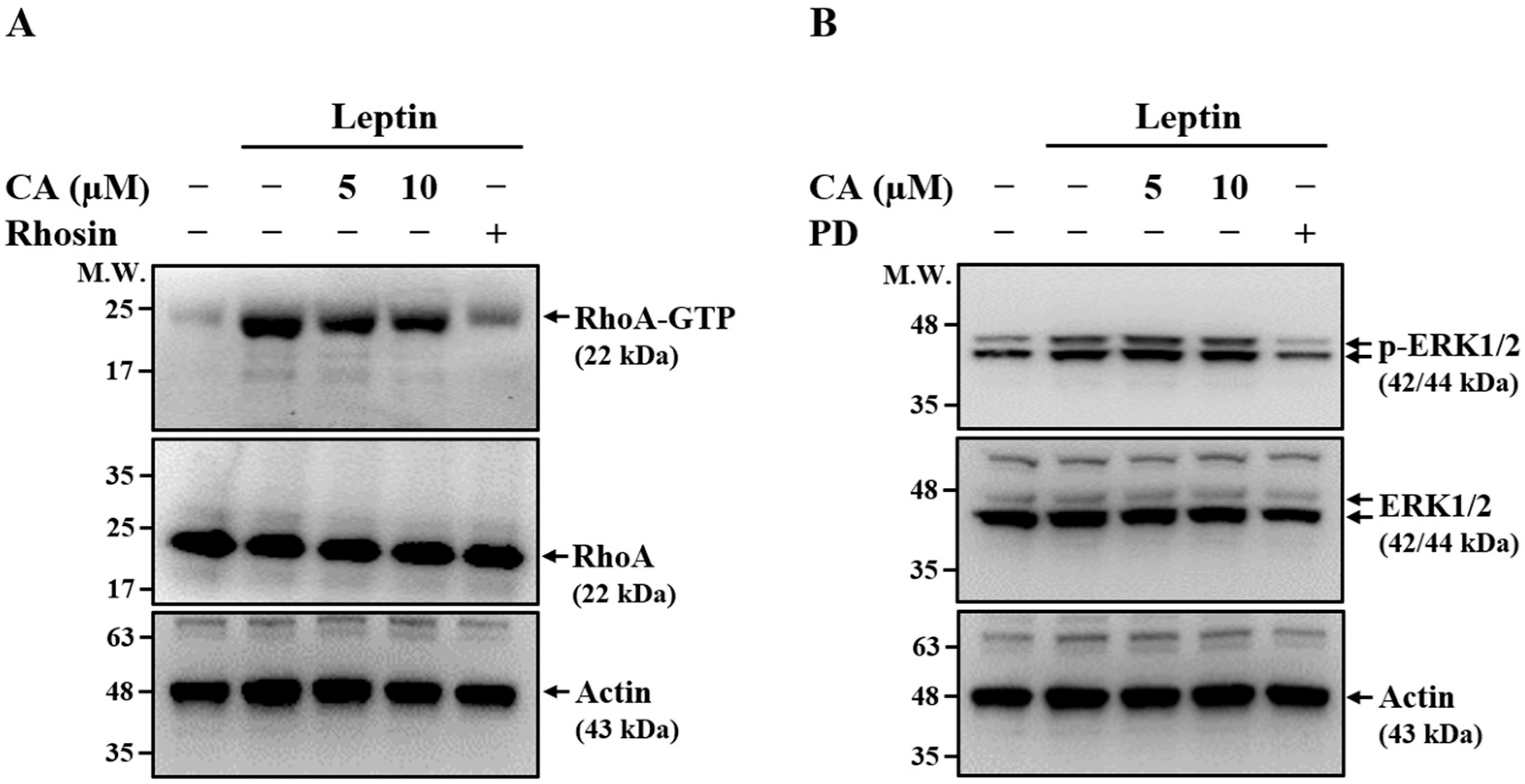 2.2. Effect of CA on Leptin-Induced Activation of RhoA and ERK1/2