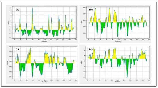 B cell epitopes were selected by several IEDB epitope servers. Yellow highlights peptides that show favorable interactions. (a) The Emini server was used to predict the surface proximity of B cell epitopes. (b) The Karplus & Schulz method was used to assess the flexibility of a few chosen epitopes. (c) The Kolaskar & Tongaonkar approach was used to assess the final epitopes antigenic potential. (d) The Parker approach was used to analyze the hydrophilicity.