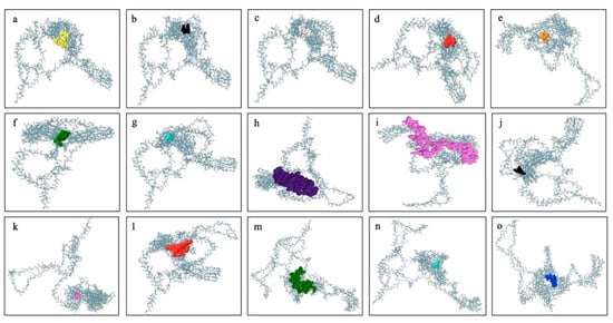 The final vaccine design shows the conformational or discontinuous epitopes. Predicted conformational B-cell epitopes on the vaccine construct. Epitope prediction was performed using the ElliPro tool. (a–o) present in the highest antigenic polyprotein of gp120 and Nef in 3D format. The proportions of the polyprotein are mentioned by sky blue sticks, whereas the epitopes are shown on the surface using different colors.