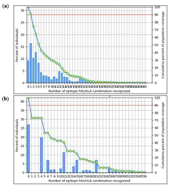 Both global and average percentages were taken into account when calculating the population coverage (%) associated with the HLA binding alleles of the chosen epitopes. (a) The chosen epitopes for MHC-I restricted alleles have, therefore, a population coverage of 90.76% worldwide. (b) On the other hand, the chosen epitopes for MHC-II restricted alleles account for a population coverage of 73.35% worldwide.