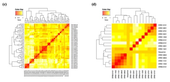 Heat map representation in cluster analysis of HLA alleles for both MHC molecules. (a,b) Cluster analysis of the MHC-I and MHC-II molecules was carried out using the most promising gp120 epitopes used in the final vaccine construct. (c,d) Cluster analysis of the MHC-I and MHC-II molecules was carried out using the most promising Nef epitopes used in the final vaccine formulation.