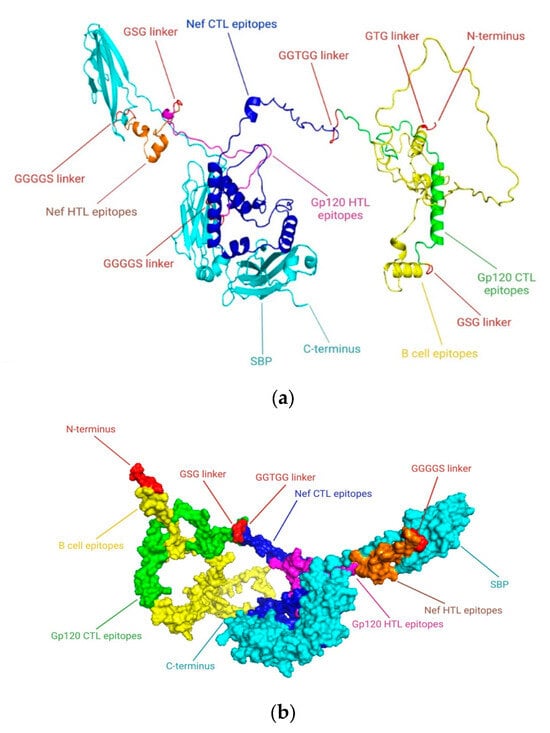 The final vaccine construct’s immunodominant B cell, CTL, and HTL epitope sequences, locations, and representations are displayed along with the 3D site and positions of the immunodominant gp120 and Nef epitopes predicted by RoseTTAFold. (a) A cartoon form represents the immunodominant epitope locations and sequences. (b) PyMOL 2.3.4 is used to represent the immunodominant epitopes in a 3D format. The positions of the immunodominant epitopes on the closed geometry of the 3D final vaccine construct are displayed in the surface representation.