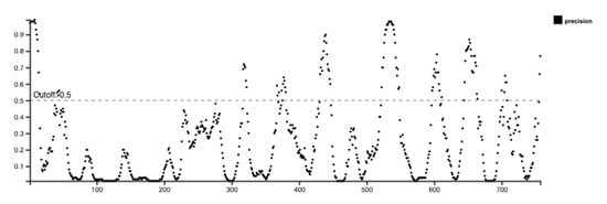 The PSIPRED tool was used to forecast the disorder regions in the secondary structure design. It has specifically located disordered areas in the protein sequence. The analysis indicates that when the dotted line surpasses the cutoff value of 0.5, which is the confidence level, amino acids in the input sequence are deemed disordered.