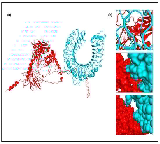 Molecular docking between the formulated vaccine and the TLR-2 receptor. (a) The cartoon of the vaccine TLR-complex is rendered with the red color symbolizing the vaccine complex and the cyan the TLR unit. (b) PyMOL presents various views of the interaction of TLR-2 and the vaccine complex. To highlight the distinction between their functionalities at the binding interface, the interaction residues of TLR-2 and the vaccine complex are proposed in different representations.