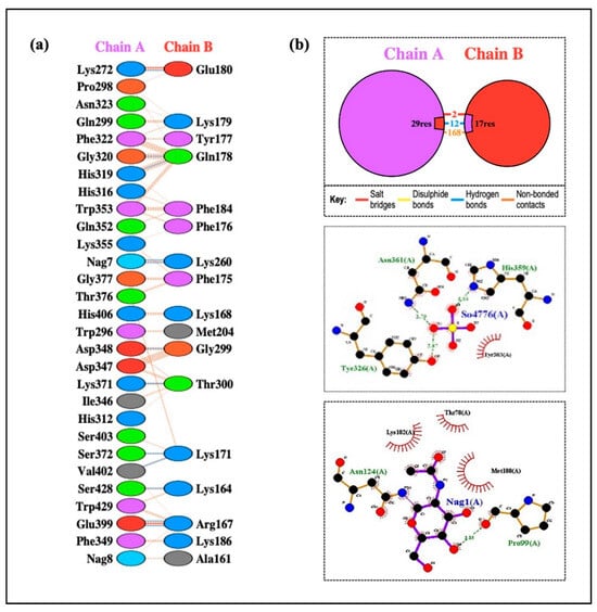 This figure depicts the binding interface in vaccine design with the active residues of the docked complex involving human TLR-2. (a) The active residues of TLR-2 are termed chain A for this molecule, and active residues of the vaccine construct are termed chain B. (b) Ligplot analysis depicts the docked conformation and interaction of TLR-2 and vaccine construct, conferring the presence of hydrophobic and hydrogen bond contacts between the constructs.