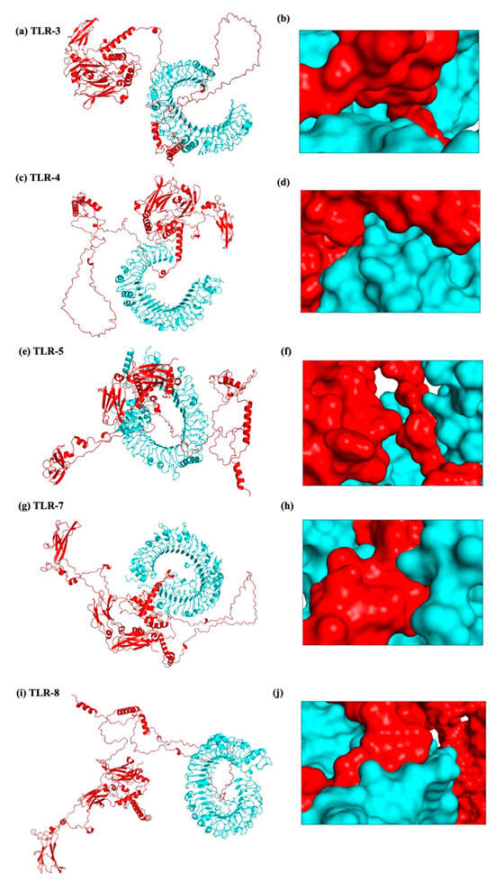 The association between the formulated vaccine construct and human TLRs was examined by molecular docking analysis. The docking areas between the vaccine construct and the TLRs were found using ClusPro. A deeper look at the docking interaction between the formulated vaccine and TLRs is shown in the figure. (a) represents the TLR-3 interplay with the vaccine construction. (b) is a closer interaction at TLR-3. (c) represents the TLR-4 interplay with the final vaccine construct, while (d) is a closer interaction at TLR-4. Similarly, (e) TLR-5 interplay with the vaccine construct, while (f) is a closer interaction at TLR-5. Further, (g) TLR-7 interplay with the vaccine construction, while (h) is a closer view of TLR-7 and (i) represents the TLR-8 interplay with the final vaccine construct, (j) shows a deep interaction of TLR-9.