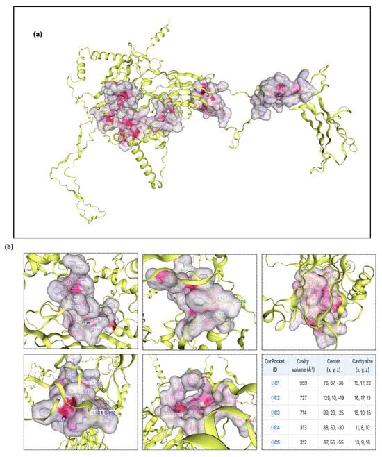 (a). Target protein predicted binding cavities found with CB-Dock2. The five top-ranked binding cavities (C1–C5) as predicted by CB-Dock2 are highlighted in the picture, which depicts the target protein’s 3D structure. According to its rank based on cavity volume, each cavity is labeled and color-coded. (b). CB-Dock2 is employed for analysis of binding cavities. Using CB-Dock2, five possible binding pockets (C1–C5) were found on the surface of the target protein. According to their volumes, the cavities are sorted with cavity C1 having the largest volume (959 Å3) and cavity C5 having the lowest (312 Å3). A list of the cavity centers’ spatial coordinates and corresponding dimensions (x, y, and z) is provided. The pockets C1, C2, and C3 exhibit the largest cavity volumes and diameters, indicating a higher possibility for ligand accommodation. These pockets are possible locations for molecular docking.