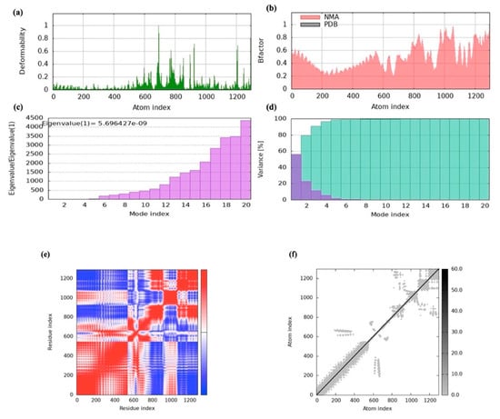 The docked complex between the vaccine and TLR-2 was simulated using MD. (a) To identify hinge regions with high deformability, a main-chain deformability simulation was run. (b) B-factor values, which provide an uncertainty metric for each atom, were computed using normal mode analysis. (c) The energy needed to distort the structure was stipulated by the docked complex’s eigenvalue. (d) The covariance matrix between residue pairs was examined and expressed by different colors. (e,f) To evoke the interactions between atoms and springs, an elastic network model was developed. Darker tones of gray indicate more rigid springs.