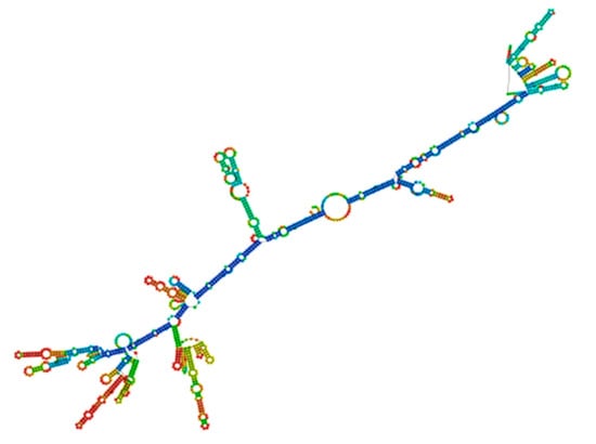 The mRNA structure of the vaccine design is depicted in this figure. The RNAfold server was used to determine the mRNA structure of the HIV-1 gp120-Nef vaccine construct. With a low free energy value of −806.89 kcal/mol, the prediction demonstrated the equilibrium of the mRNA structure of the vaccine design.