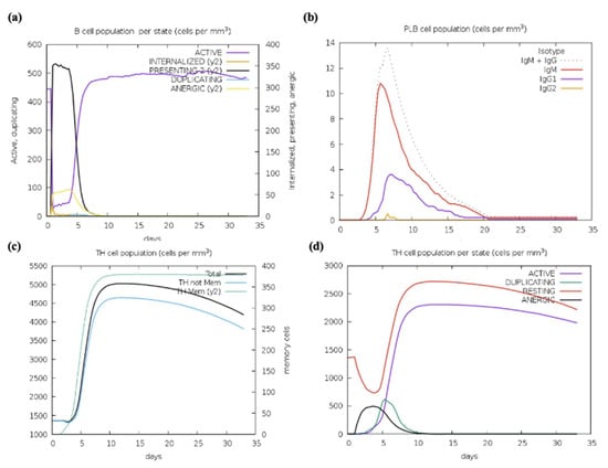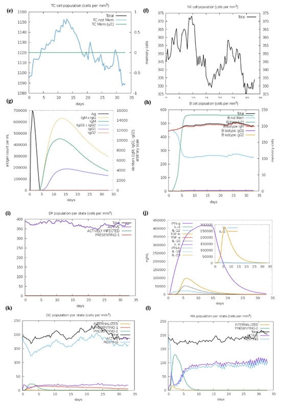The forecasted immune response to the computationally designed vaccine construct was assessed through the C-ImmSim server. The server combines agent-based simulation with machine learning algorithms to generate immune response predictions through the position-specific scoring matrix (PSSM). The simulation ran through 1050 steps to replicate the interval of four weeks between vaccine doses. The simulation process treated both injections through a virtual eight-hour period to match the real-time sequence of events. The analysis preserved all default parameter values throughout its execution.