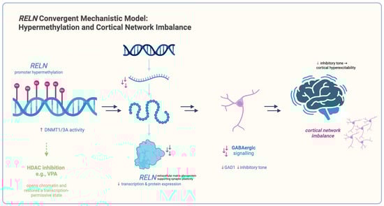 | RELN | — | Promoter hypermethylation in BA9 [88,89] | ↓ RELN mRNA in DLPFC [88,89] | — | VPA restores H3K9ac at RELN promoter and increases mRNA [93] |